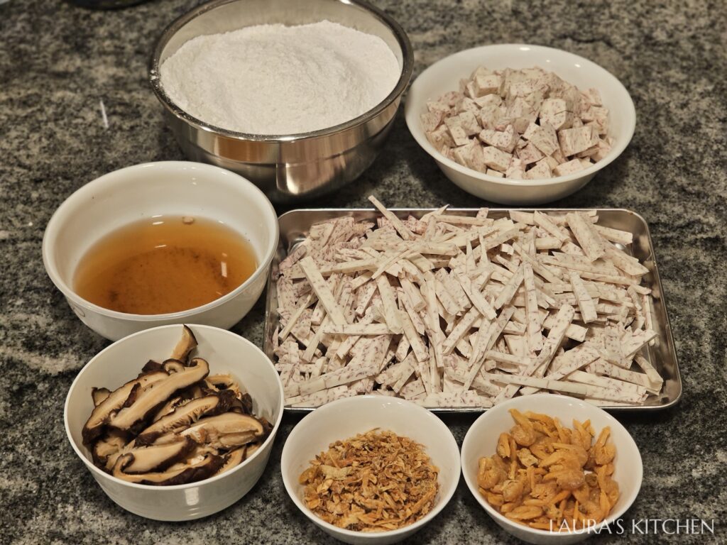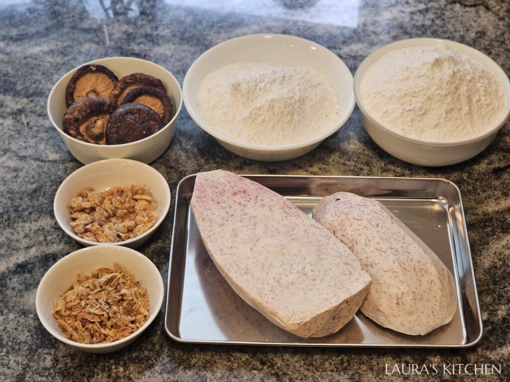 1. 把芋頭一半切丁、一半刨絲;糯米粉和沾米粉混和,香菇和蝦米用水泡開後,香菇去梗切細絲