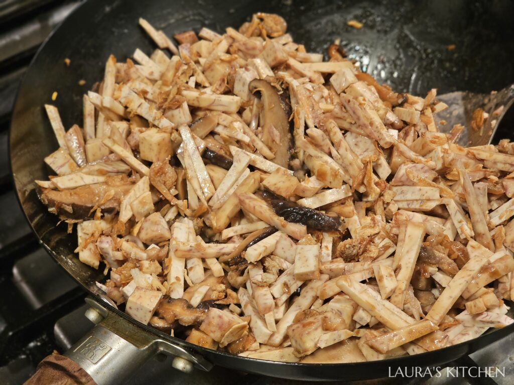2. 把香菇和蝦米爆香,加入芋頭丁和芋頭絲拌炒,飄出芋頭香氣後,加入醬油、白胡椒粉調味,最後再拌入油蔥酥,炒香後關火