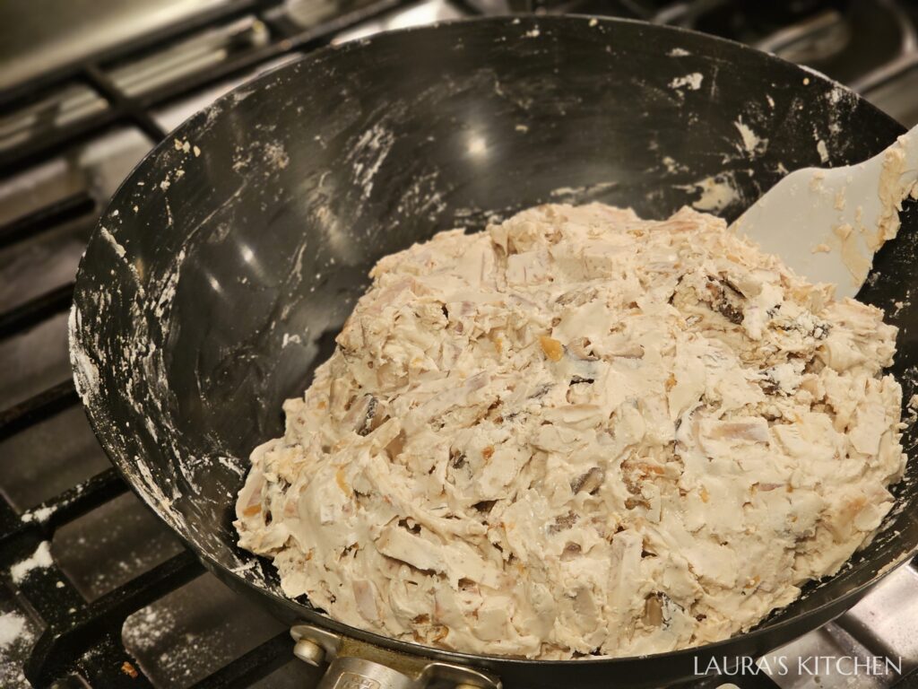 3. 把粉倒入鍋中,倒入水和剛剛泡香菇的水,用刮刀慢慢翻拌成團