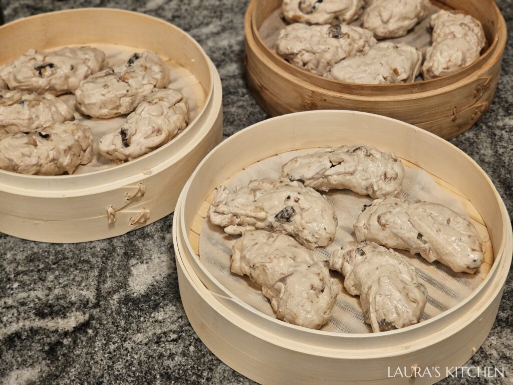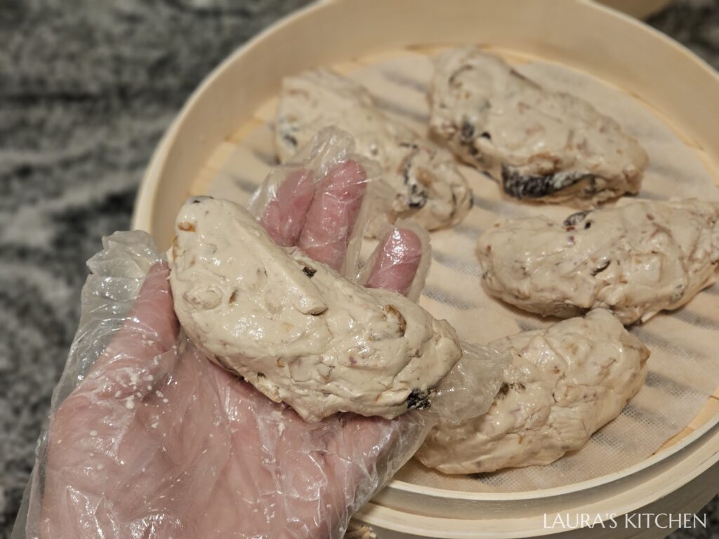 4. 手沾一點油(或戴手套),捏起一團芋粿、塑形成擲茭的形狀,有一點彎彎的,放入蒸爐中。芋粿巧下面要墊蒸籠紙或是包子紙,這個分量可以做15個左右