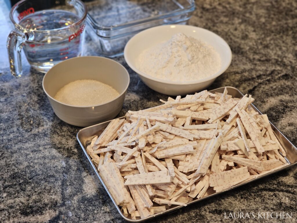 1. 將材料秤好份量: 芋頭、樹薯粉、砂糖、水,把芋頭塊切成細絲、或刨成簽狀。準備一個耐高溫容器(例如玻璃保鮮盒),刷上一層薄薄的油