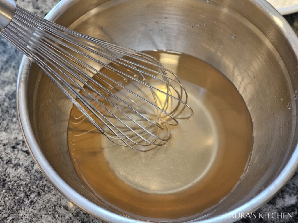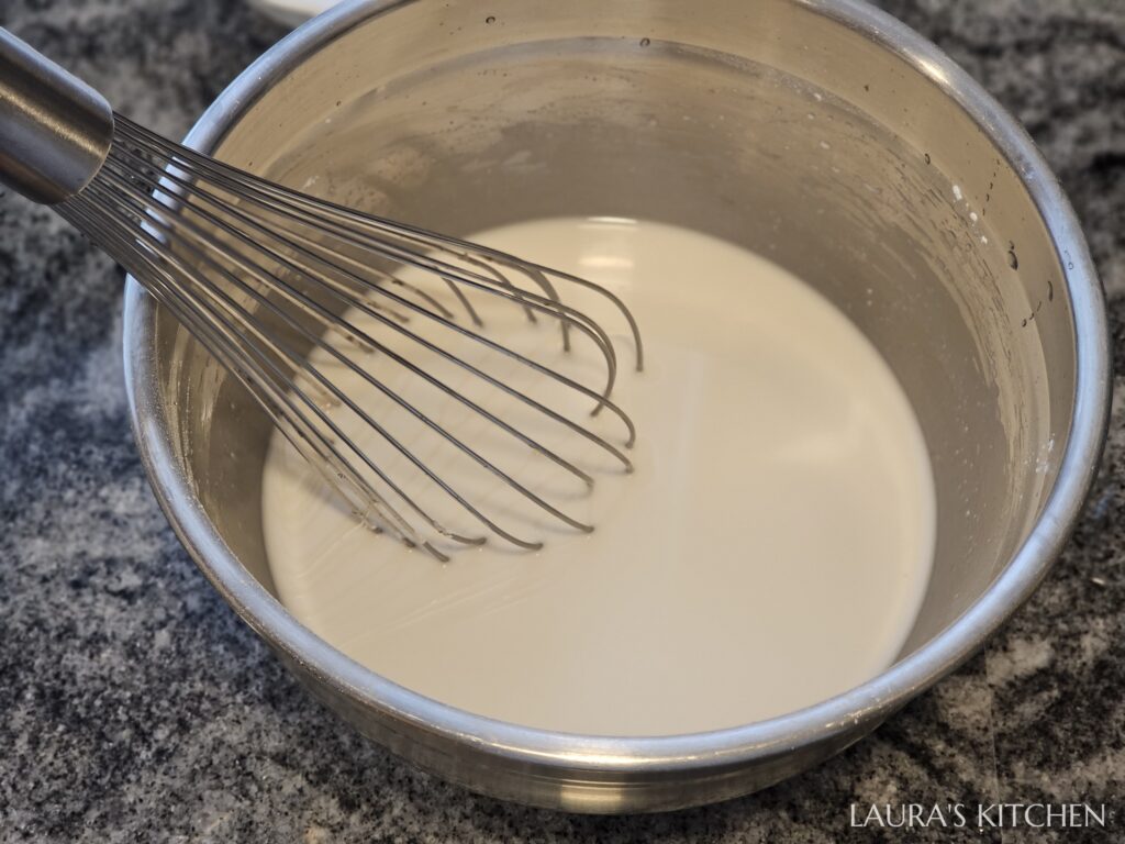 3. 將砂糖倒入水中,快速攪拌讓砂糖融化,接著倒入樹薯粉,攪拌均勻成白色的粉漿