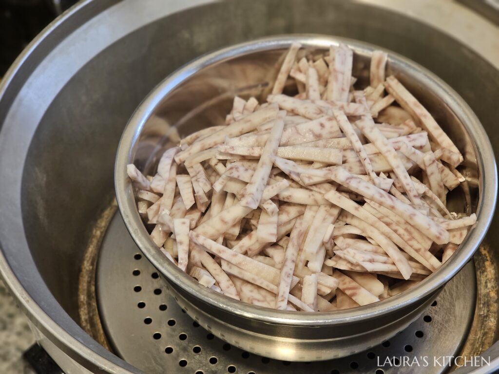 2. 先將芋頭籤放入電鍋,外鍋放入一米杯水,蒸到芋頭熟透