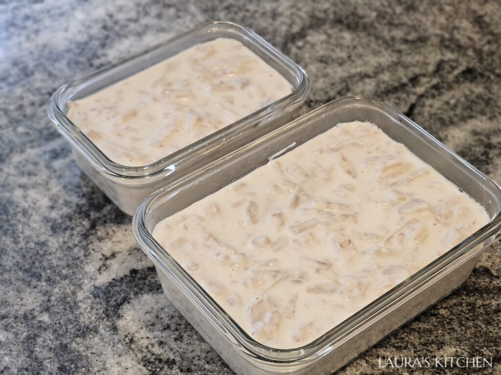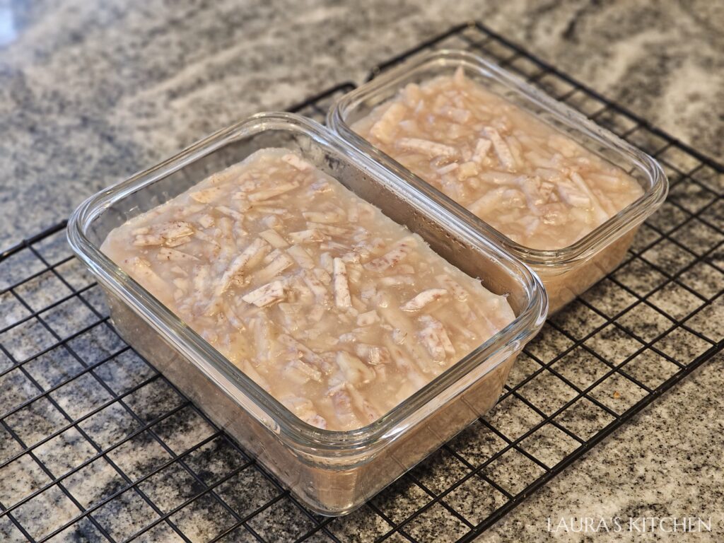 4. 把蒸好的芋頭籤與粉漿充分混和,倒入玻璃保鮮盒中,把表面抹平。外鍋放入2杯水,放入電鍋蒸至跳起(約30分)