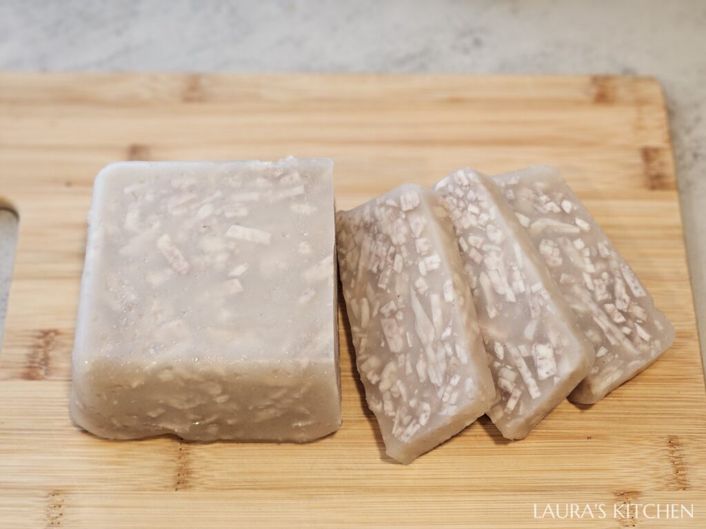 6. 把芋頭糕切成厚片,滿滿的都是芋頭絲,自己做就是這樣真材實料阿! 芋頭糕放涼後,直接吃超Q超好吃! 也可把兩面煎到金黃,或切條下去油炸,就是鹹酥雞攤必點的水晶芋頭糕啦!