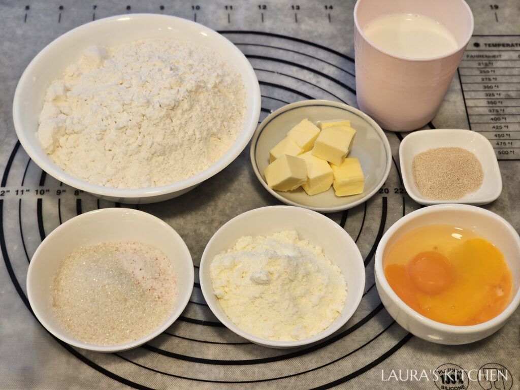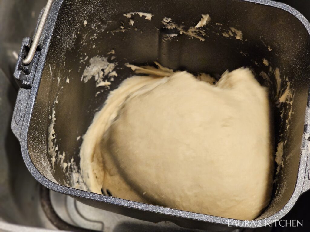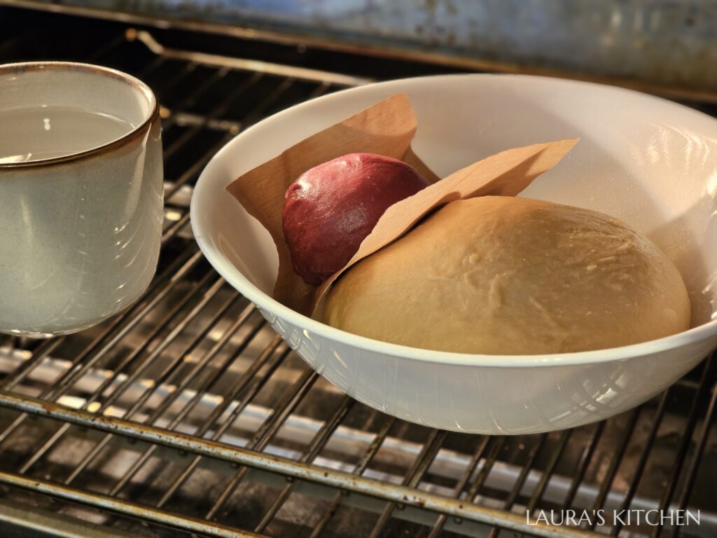 1.打麵團: 在攪拌盆中依序放入液體、麵粉等(奶油、紅麴粉以外材料),低速攪拌到麵團成型、產生筋性。加入無鹽奶油,中速攪拌到麵團表面有光澤感,可拉出手套薄膜的完全擴展狀態。把麵團取出,切下100g,加一小匙紅麴粉,攪拌到變成紅色。把打好的兩個麵團放入盆中,放入發酵箱(溫度攝氏28度)進行基礎發酵40分鐘