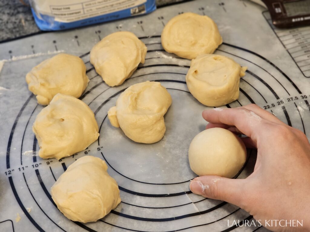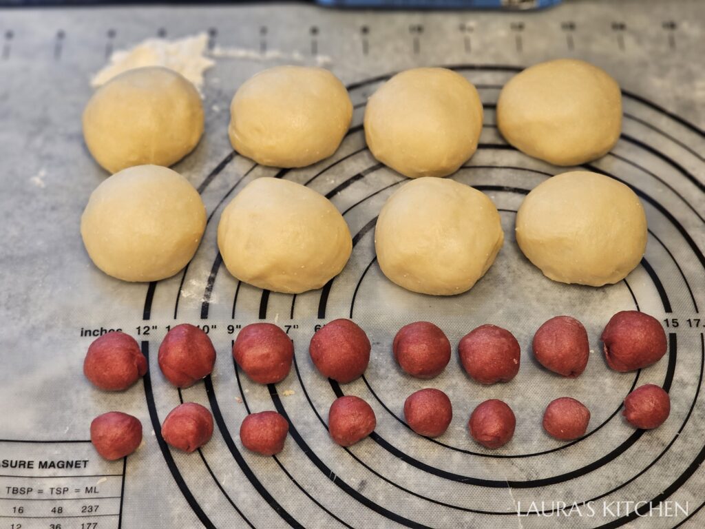 2. 麵團分割: 把原味麵團平均分割為八等分(約66g),滾圓後靜置10分鐘。紅色麵團切成4g、8g各8等份,用手把平整表面朝外、捏成光滑小圓,靜置10分鐘