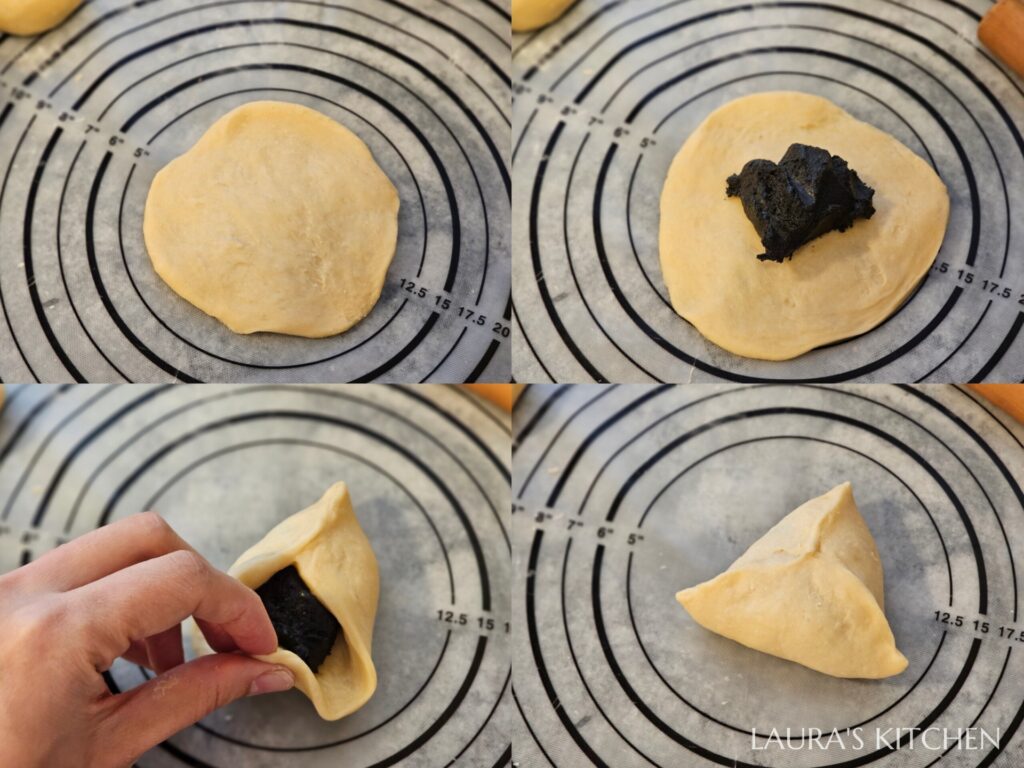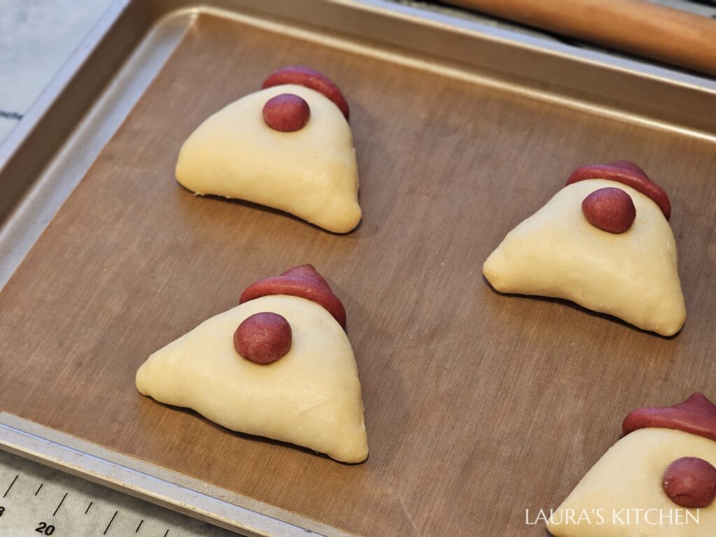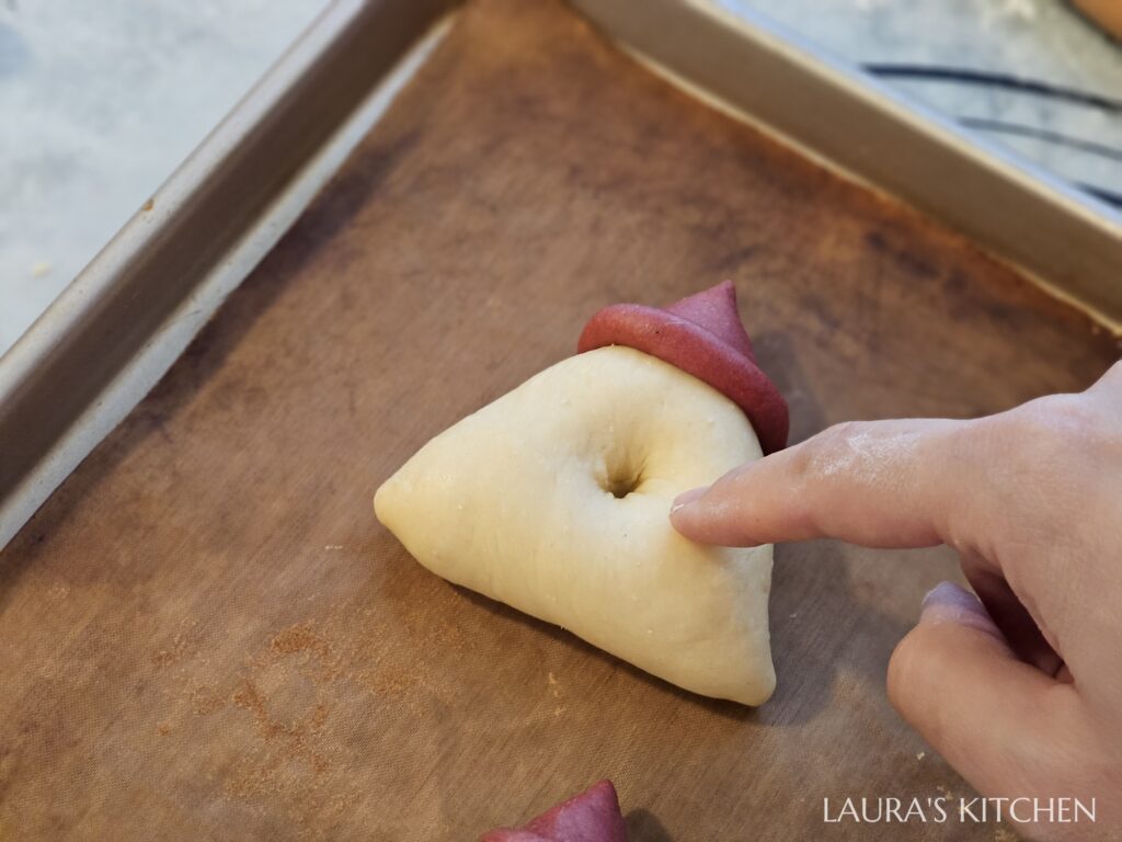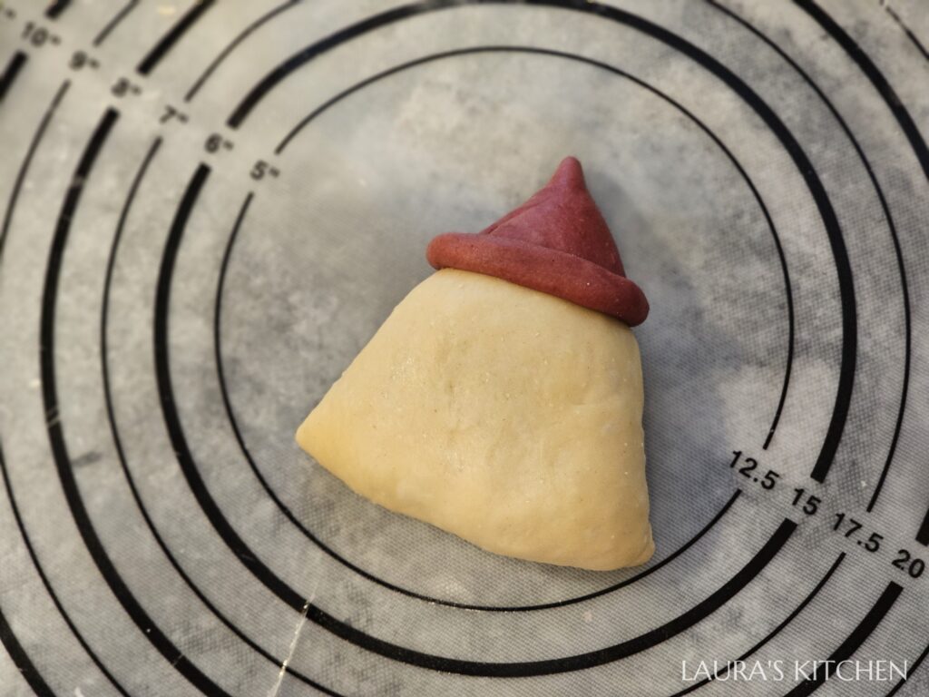 3. 包餡: 把原味麵團粗糙面朝上,壓扁成巴掌大(約4寸大小),放入一大匙麵包內餡(可以用紅豆餡、芋泥餡、奶酥餡等等,我用的是黑芝麻抹醬),把麵團的三邊往內、收成一個三角形,收口捏緊。把紅色大圓擀長,一邊捲起一點點,放上三角形麵包的其中一角,往後包起來、捏緊,就是聖誕老人的帽子了