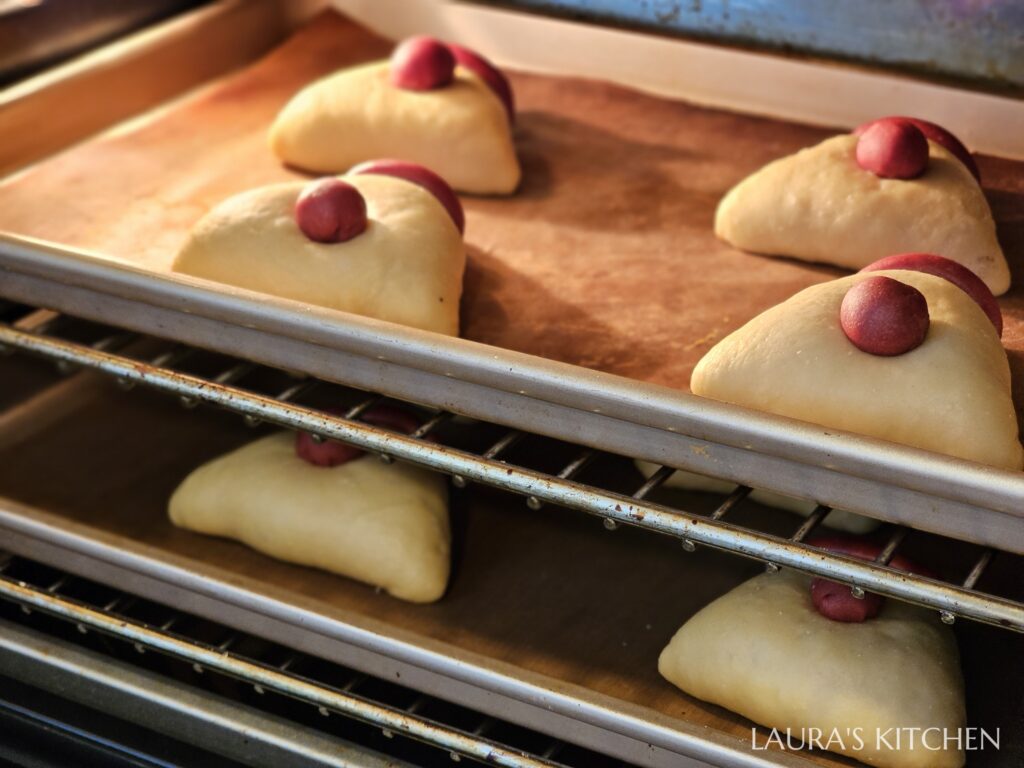 4. 在正中間往下壓一個凹洞,放上紅色小圓,這是聖誕老人的鼻子! 把包好的麵包,放入發酵箱中,二次發酵60分鐘
