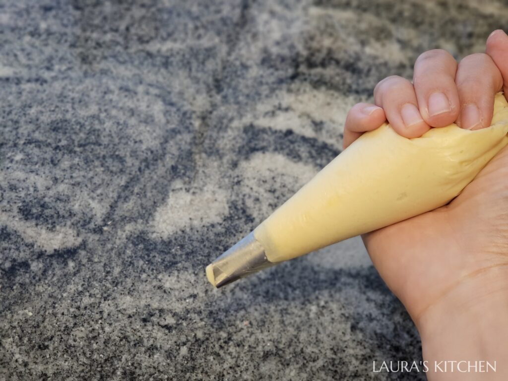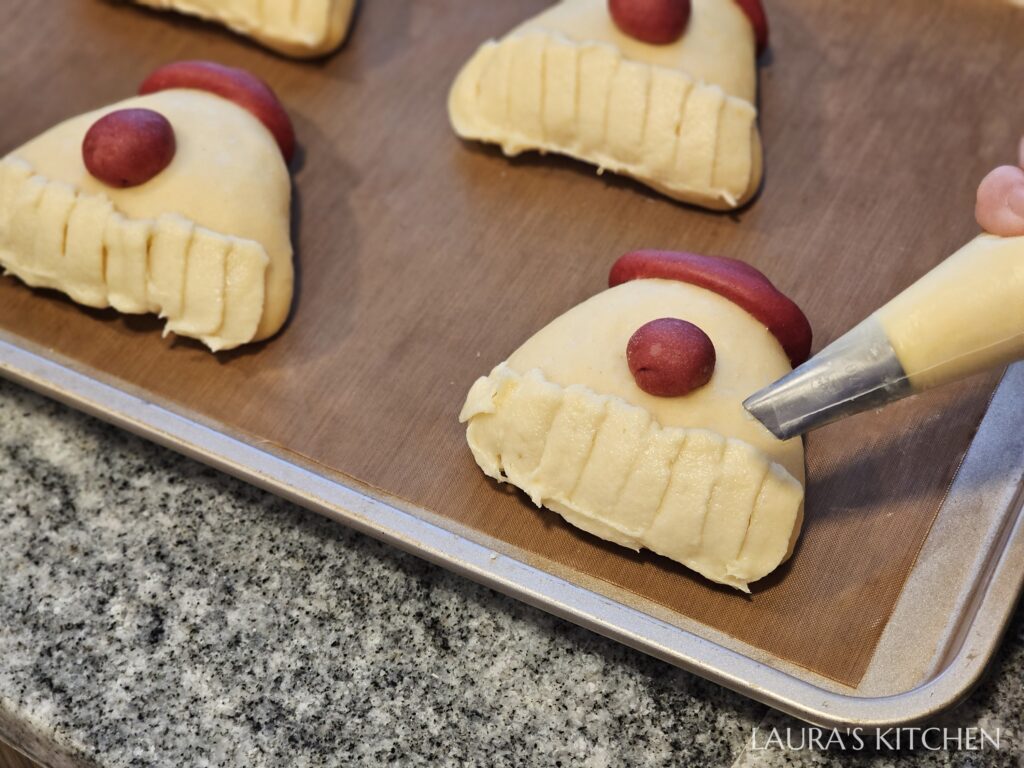 5.奶酥醬: 等待的時候來做奶酥醬,把無鹽奶油室溫放軟,加入糖粉壓拌均勻。再加入鮮奶、低筋面粉,全部拌勻之後就是奶酥醬了。裝入擠花袋、放入一個扁平擠花嘴,放室溫備用。等到麵包發酵完畢,在聖誕老人的下巴擠上一排奶酥醬(鬍子),還有兩道眉毛,就可以準備進爐烘烤了