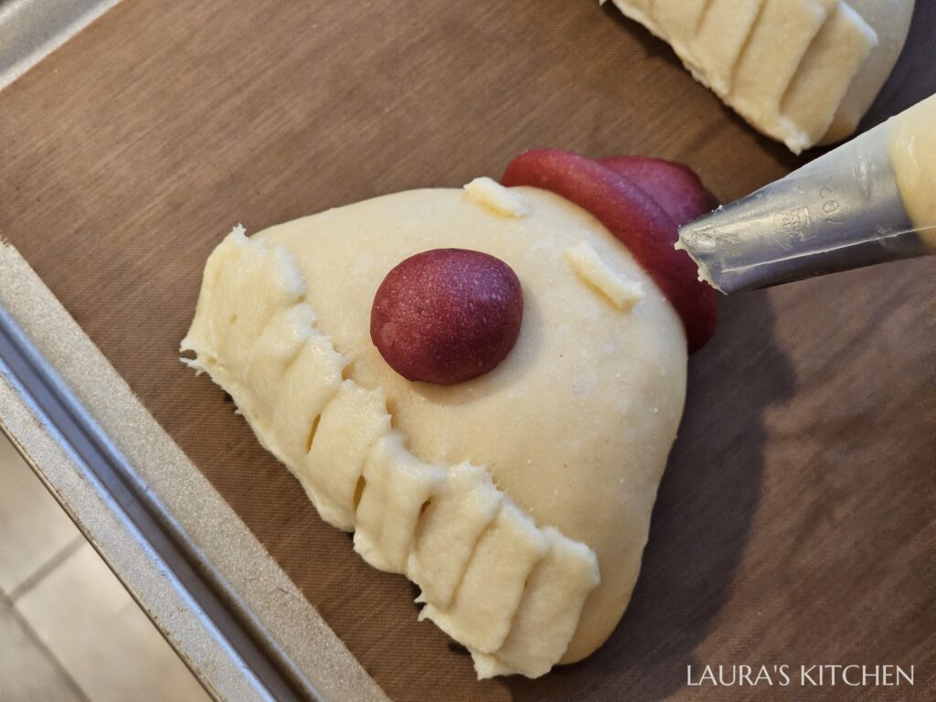 用紅麴粉把一小塊麵團染成紅色,做成聖誕帽和鼻子,擠上奶酥醬當鬍子和眉毛,造型過程不會很難,還非常療癒!烤的時候記得在旁邊顧爐,才不會一不小心上色太深,就變成曬傷的聖誕老人了! (原食譜參考自趙歡喜)