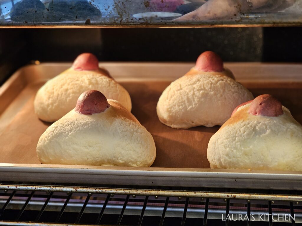 6.烤箱預熱華氏370度/攝氏185度,烤溫到後,進爐烘烤15分,中間要掉頭一次均勻受熱。最後五分鐘要在旁邊顧著,像我烤的時候上色太快,聖誕老人就曬成健康膚色了! 麵包放涼後,用融化巧克力(微波20秒)畫上眼睛,就大功告成囉!