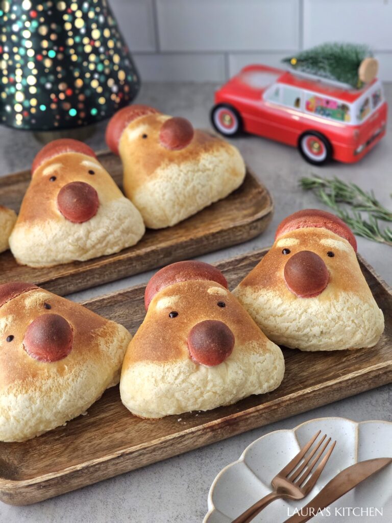 是誰在出遠門當天早上,還在烤麵包啦! 前一晚看到這個可愛的造型麵包,讓我手癢到沒辦法忍到明年再烤,想說反正是晚上的飛機,下午五點才要出門,我就邊整理行李、邊烤了這一盤聖誕老人麵包囉!