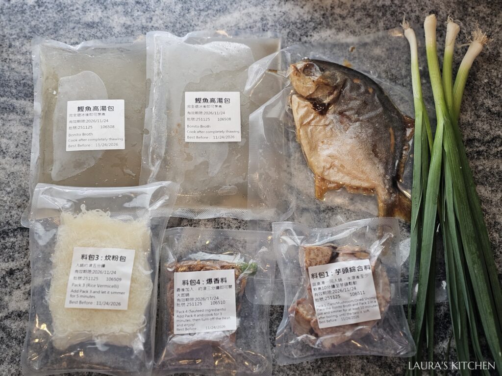 擺盤秘訣: 依照包裝指示,把鰹魚高湯、食材包、爆香料依序下鍋煮即可。最後記得把金鯧魚擺在炊粉的表面,切一點新鮮蒜苗(或leek)、整顆炸蒜頭(可省)、油蔥酥,就完成了!