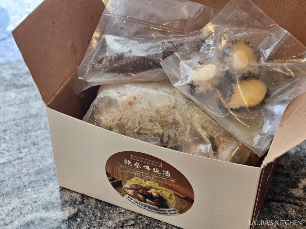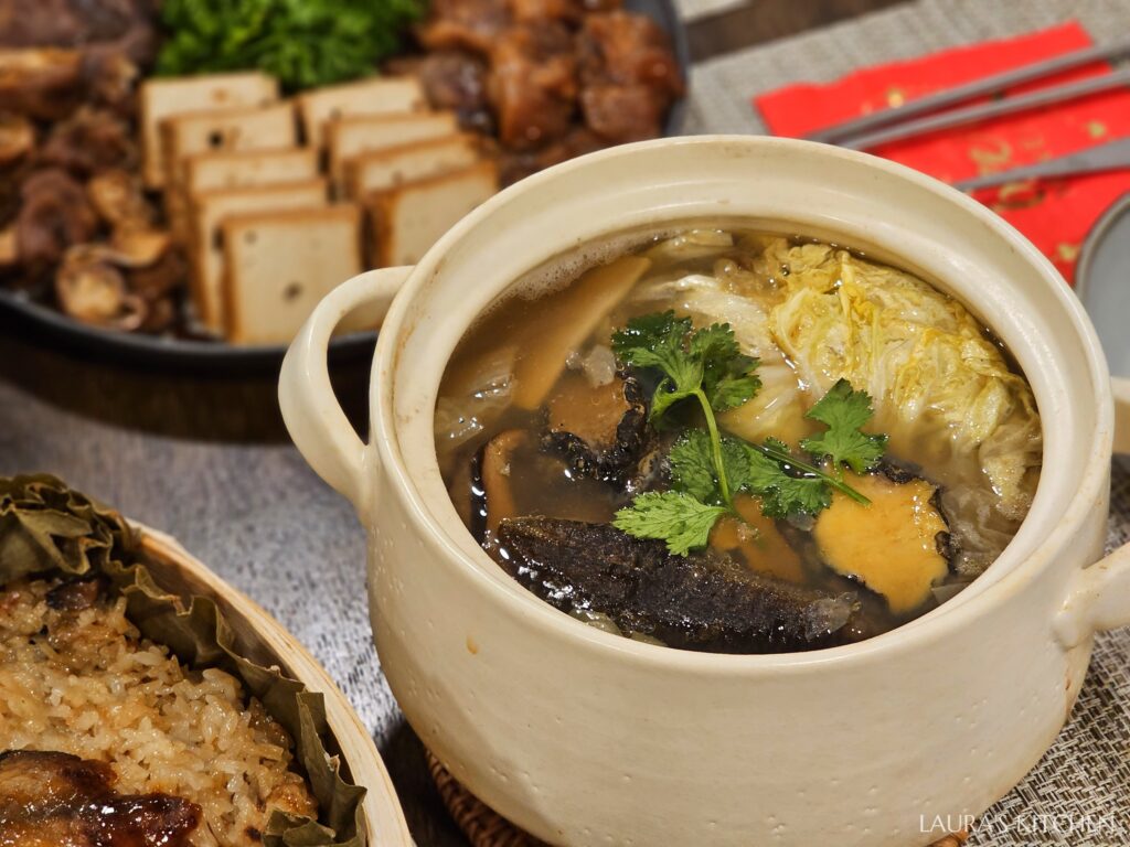 年夜飯首選湯品就屬佛跳牆了,一定要放在年菜C位! 來自老字號餐廳彭園,鮮美的海鮮湯頭中,裡面放的料超級澎湃,有三顆大鮑魚、烏參、珠貝、金勾蝦、筍乾、多種菇類,還有入味的滷白菜芋頭!