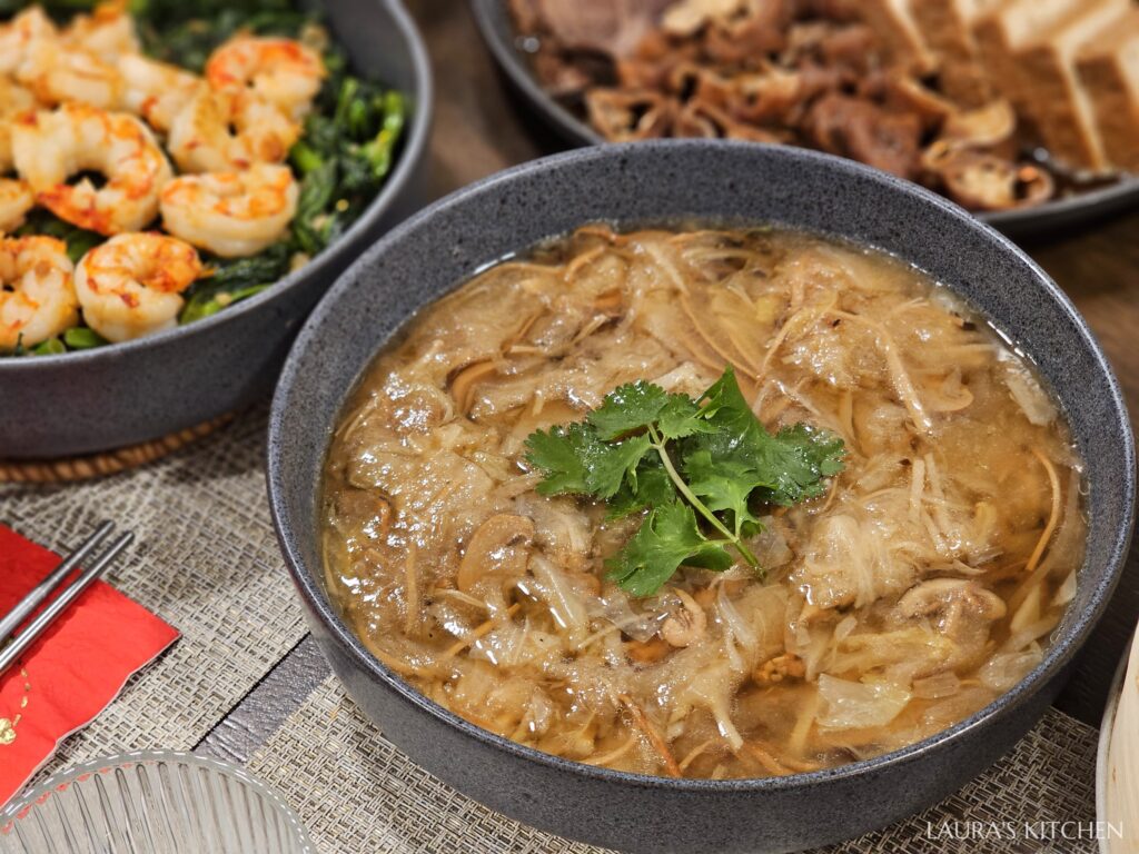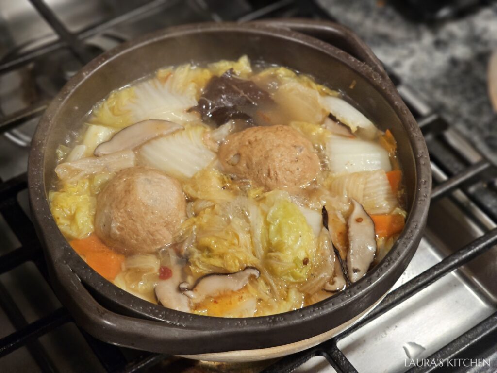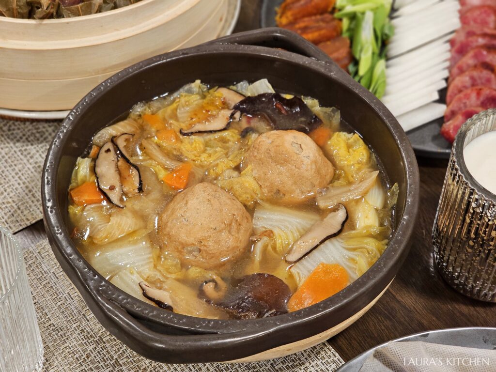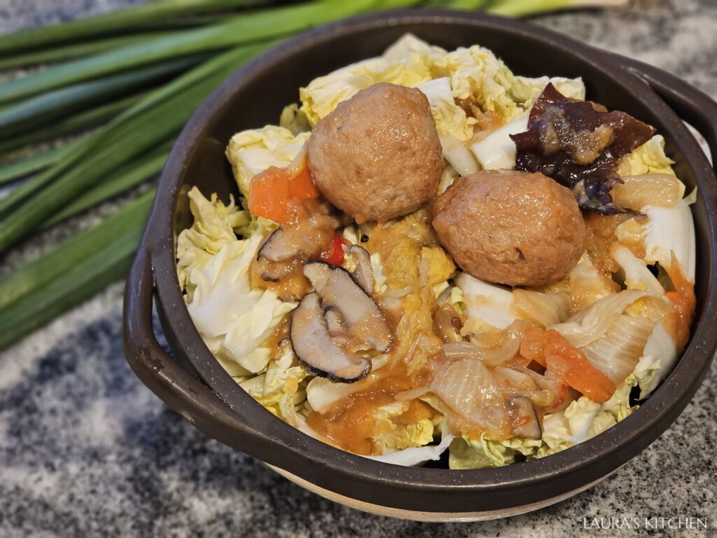 兩大顆圓滾滾的獅子頭,象徵圓滿和富貴,搭配大白菜、香菇、紅蘿蔔、黑木耳,以紅燒口味燉煮到入味,這道菜超適合過年端上桌!