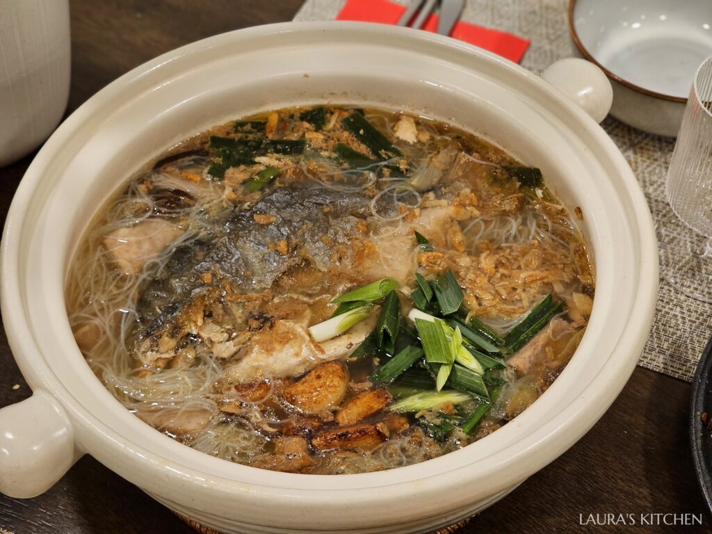 這鍋獲得當晚大家一致好評! 首先是這鍋的用料很實在,用的都是台灣在地食材: 安永金鯧魚、大甲芋頭、新竹炊粉、東港櫻花蝦、南投香菇、宜蘭蒜苗,煮出來的滋味台到不行! 吃到最後剩一小碗湯,因為太鮮了,隔天我又加了白菜、丸子、冬粉,變成一鍋熱騰騰的小火鍋!