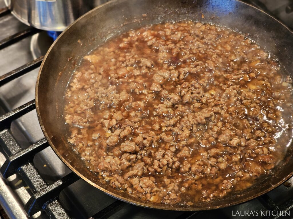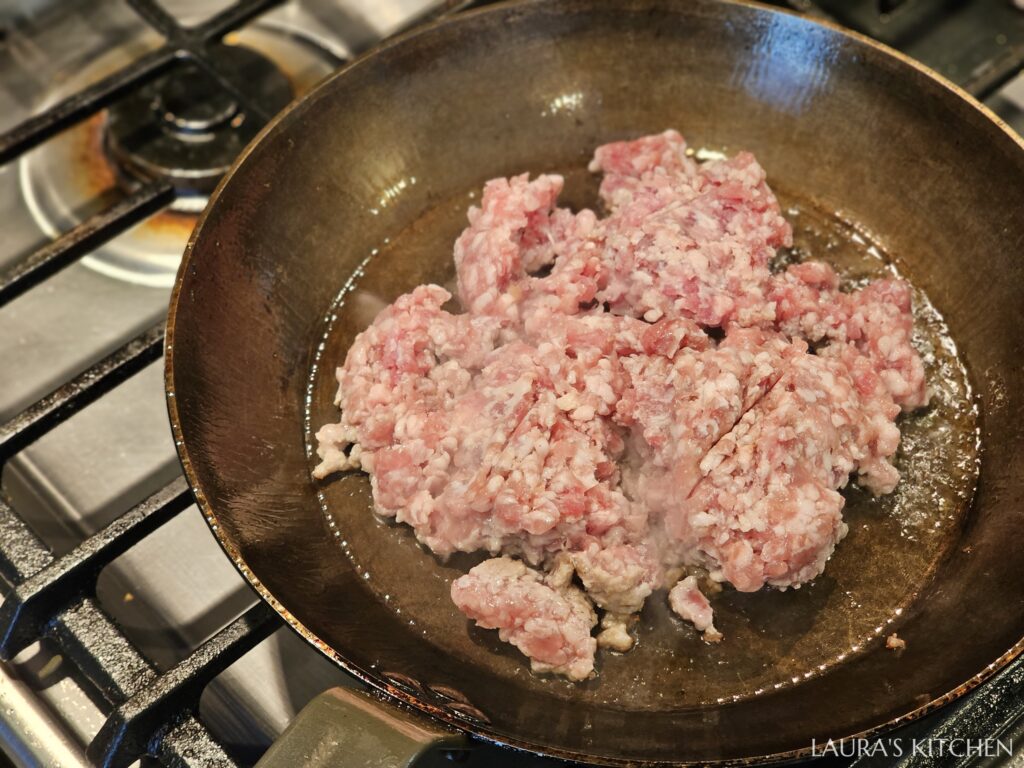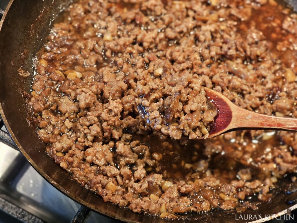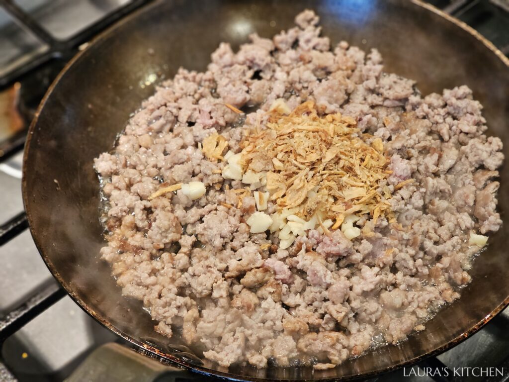 2.滷肉燥: 絞肉下鍋,先壓扁、再翻面,熟了之後用鍋鏟剁剁剁、炒散開來,加入蒜末、油蔥酥,炒出香氣。接著嗆入醬油,加米酒、冰糖、白胡椒粉和水(淹過絞肉),醬汁滾起後轉小火滷半小時,入味即完成