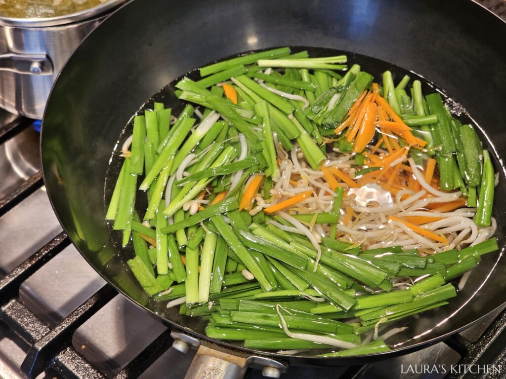 3. 燒一鍋滾水,把韭菜、豆芽菜、紅蘿蔔下鍋燙1分鐘,撈起瀝乾