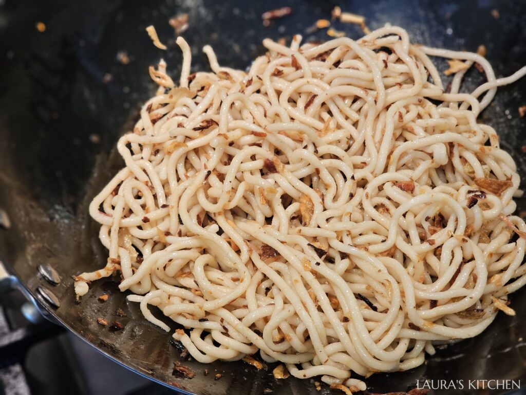 4. 熱鍋,加入2大匙豬油(或一般油),把油蔥酥小火炒香,關火 (這一步驟也可用豬油,炒新鮮紅蔥頭)。加入鹽、胡椒粉、雞粉(或柴魚粉),燙好的麵條全部倒入,用筷子快速翻拌直到麵條裹滿油。是的,原來台中炒麵是用拌的,不是用炒的!