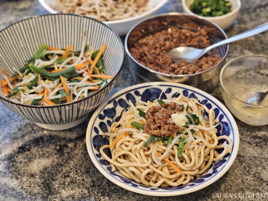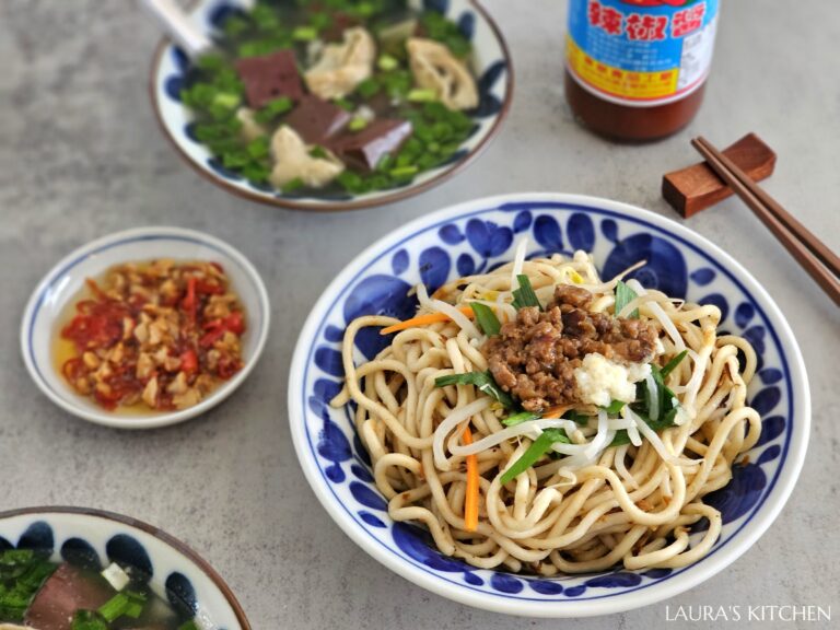 5. 把炒麵夾入碗中,放上一點燙韭菜豆芽,淋上一大匙滷肉燥,一小匙蒜泥水 (蒜泥沖一點熱水),這一碗就是台中人最愛吃的早餐炒麵啦!