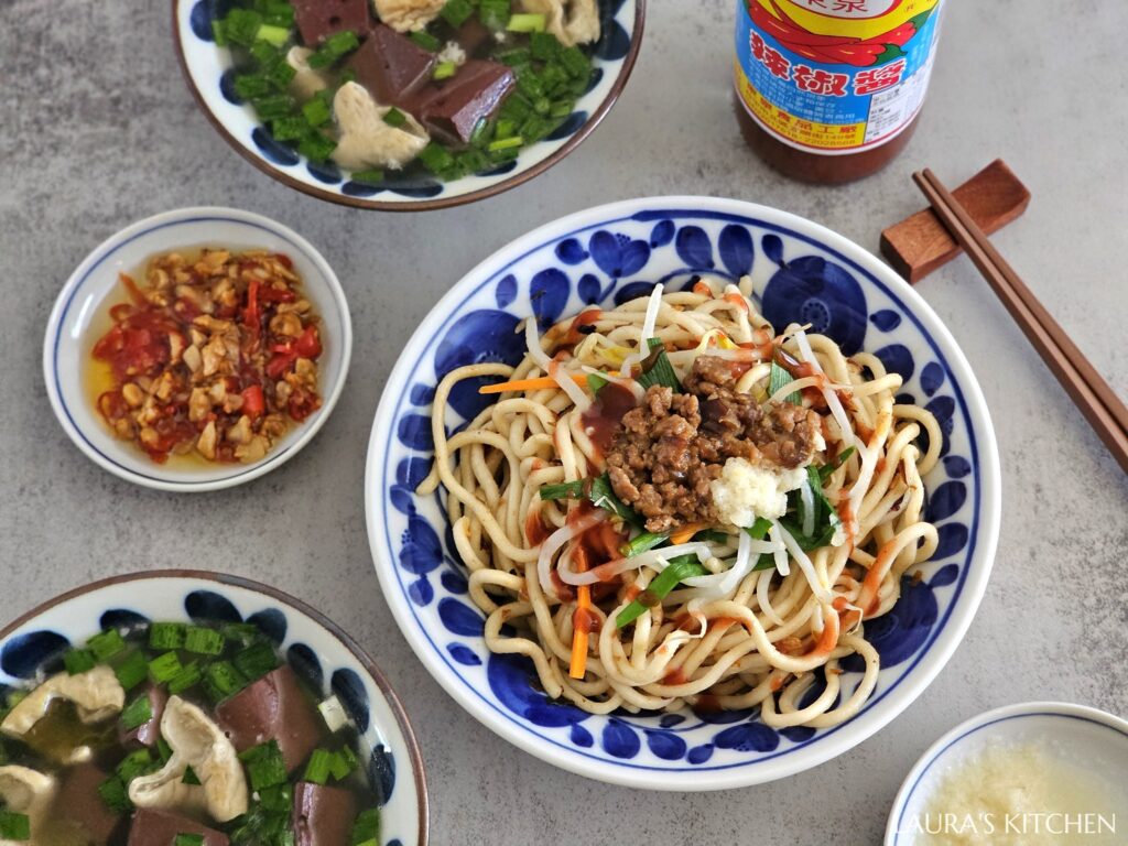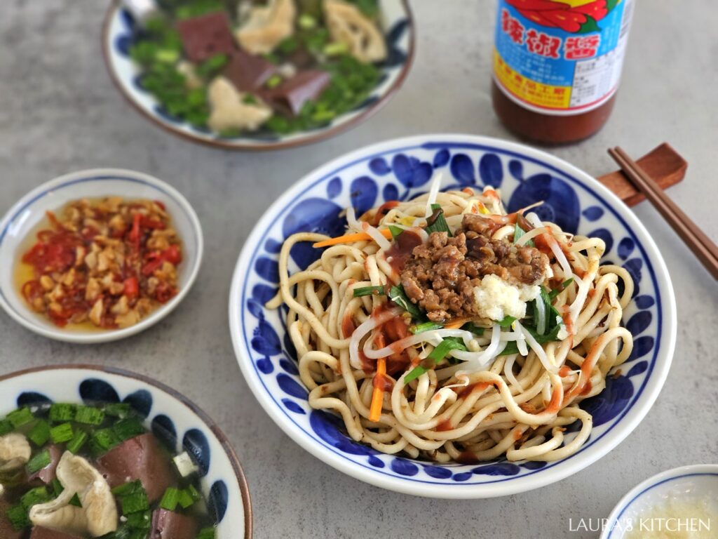 後來才知道,原來這個組合是台中特有的早餐文化。不像熱炒店的炒麵,配料豐富、麵條裹滿芡汁,也不像中式炒麵帶有醬香的鑊氣。台中炒麵看起來樸實無華,沒什麼特別配料,但帶著油蔥的香氣,淋一匙滷肉燥,加一匙蒜泥水、還有東X辣椒醬!!! 拌一拌的滋味非常迷人,這就是最經典的台中炒麵啦!