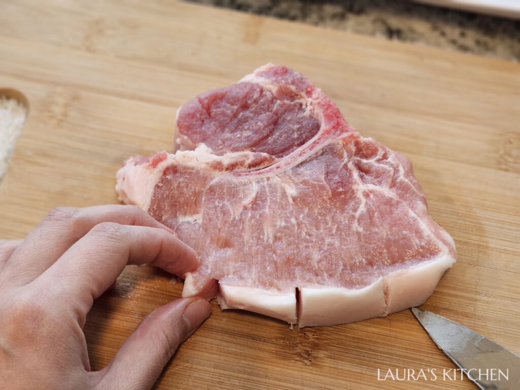 1.處理肉排: 建議買帶骨的豬里肌肉,因為帶骨的比較大片,吃起來比較過癮。我在美國好市多買的豬排約2公分,有點太厚、較難入味,厚度1.5公分最剛好,若太薄容易炸太乾。用刀尖把白色的筋膜切斷,煮過才不會捲起來。接著用肉槌把豬排拍扁,拍過會打斷肉的纖維、讓肉質變的軟嫩,大小會變成原本的1.5倍大