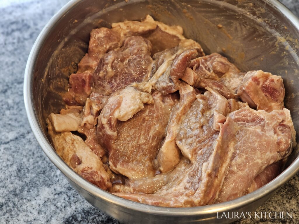 2. 醃排骨: 把醬油、蠔油、砂糖、白胡椒粉、五香粉、蒜泥倒入盆中,加100cc的水調均勻,把拍扁的豬排放入,先大致混和均勻。接著加入太白粉,不只可以軟化肉質,也可鎖水讓肉更多汁。攪拌到醬汁都被吸收後,最後加一點香油,讓肉更滑嫩
