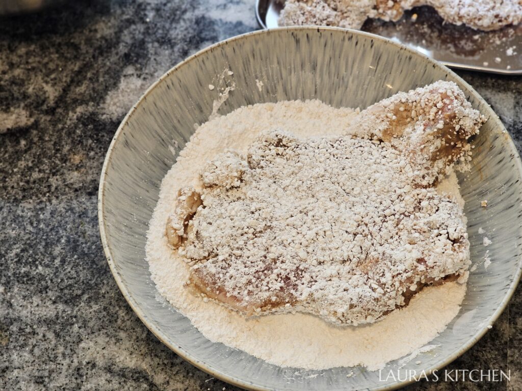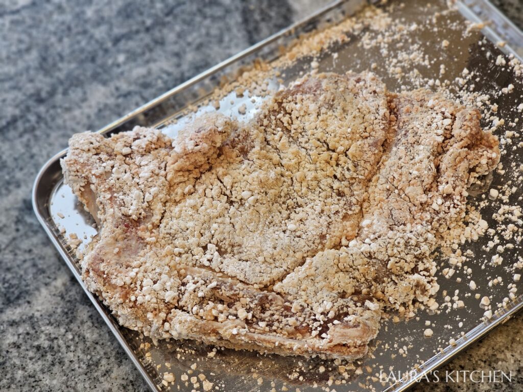 4. 醃好的豬排沾上粗粒地瓜粉,除了正反兩片、邊邊也要沾好沾滿。靜置半小時讓豬排返潮,這樣炸衣才會緊緊附著在豬排上,炸過也不易掉落