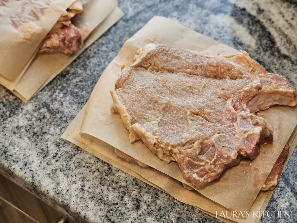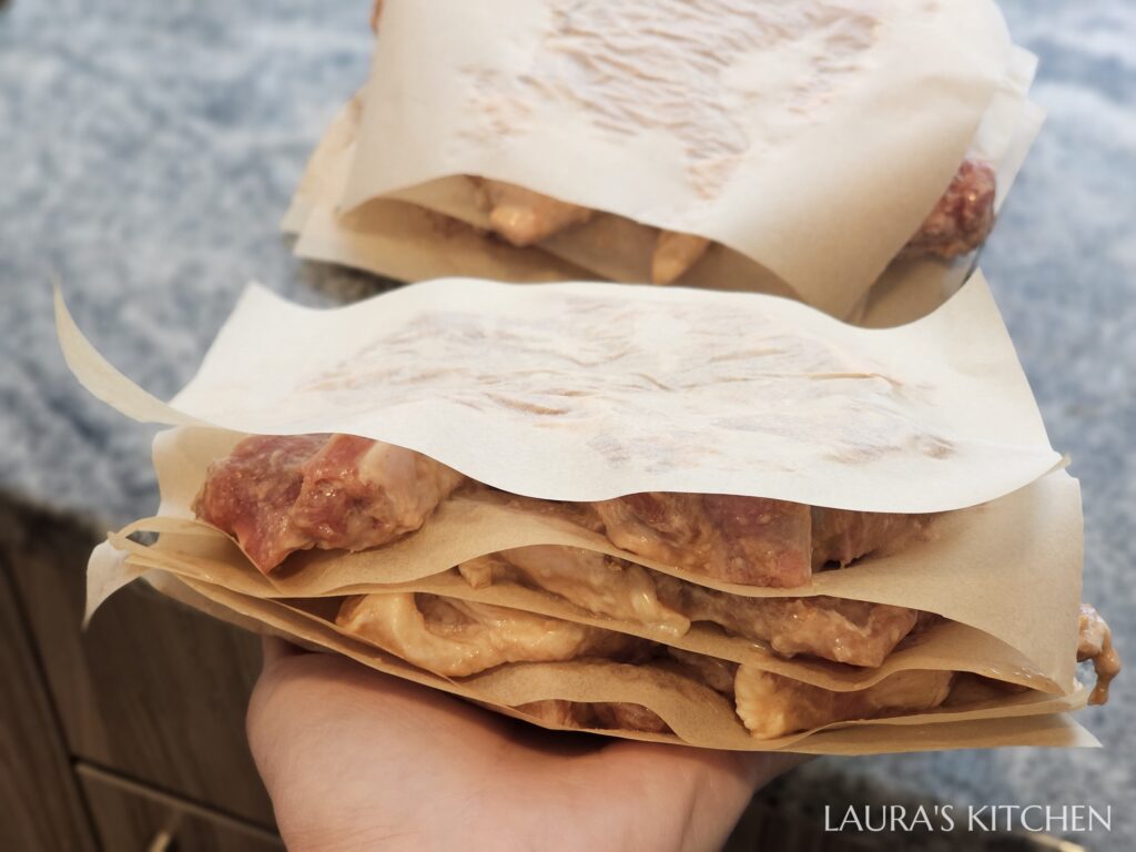 3. 醃一小時的豬排骨就可以馬上料理,若沒有要馬上煮,可以把豬排骨攤開,用烘焙紙一片片隔開,放入冷藏(2天)或冷凍(1個月)保存,要煮的時候拿取比較方便