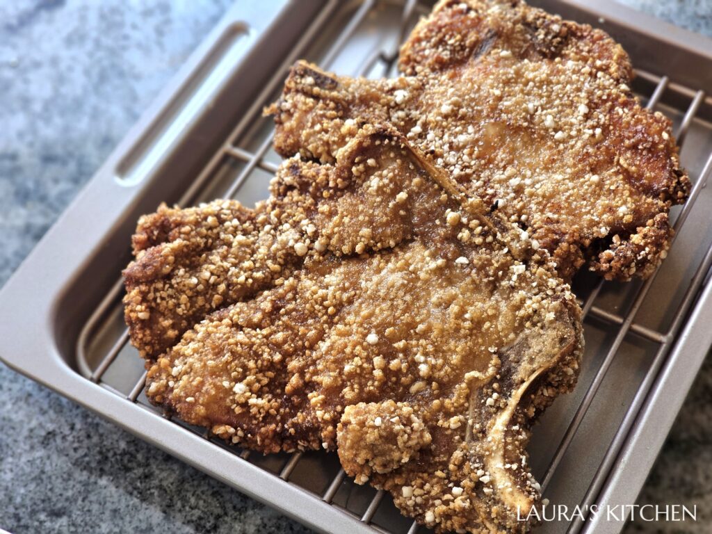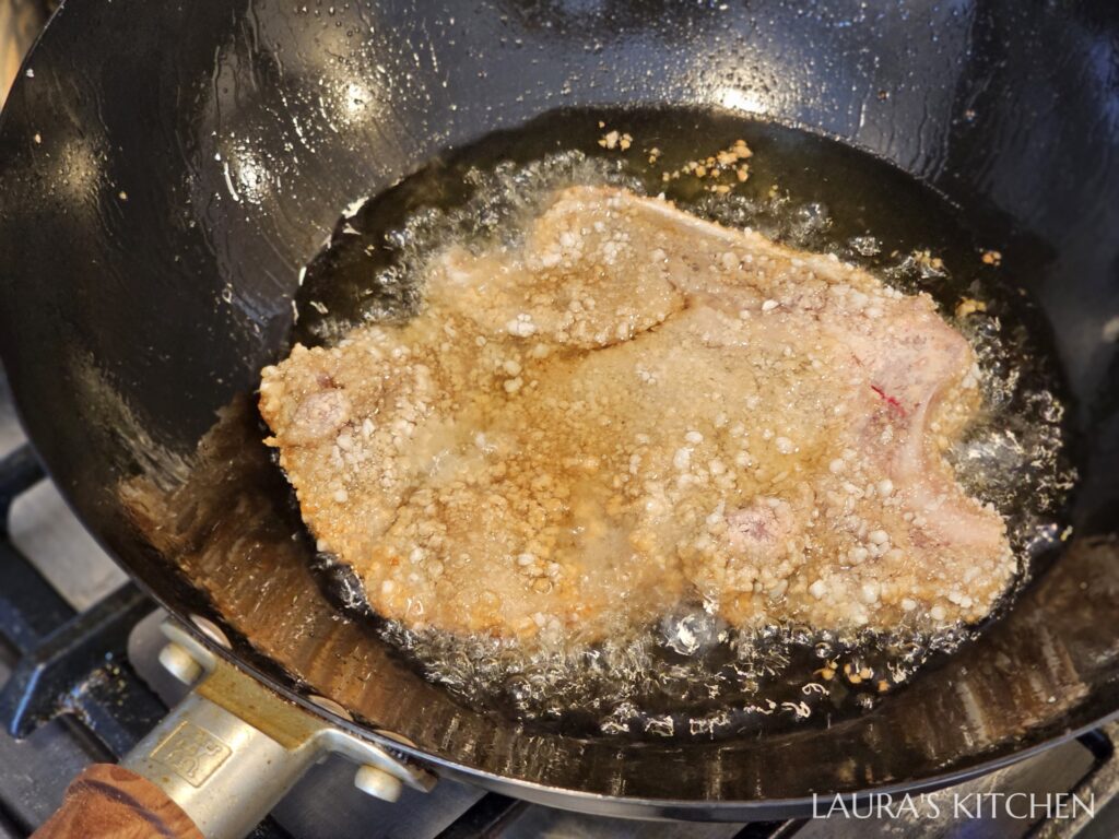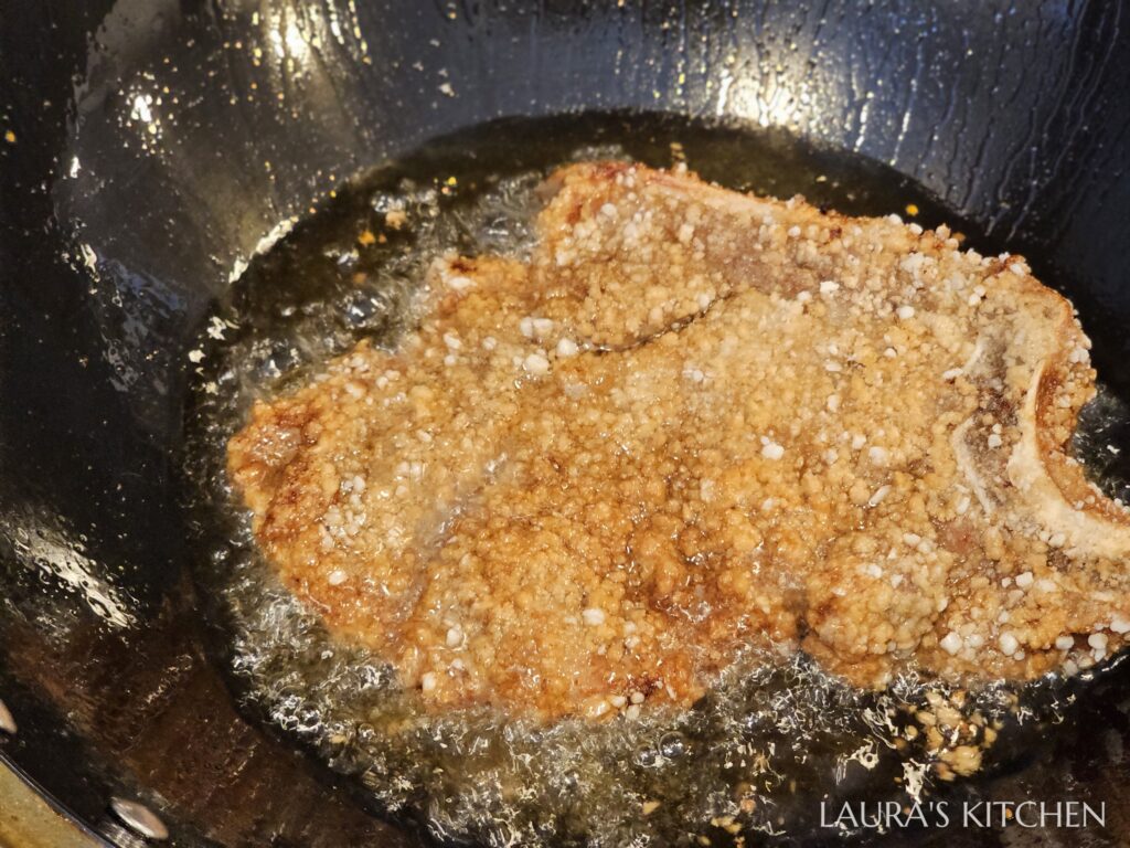 5. 熱油鍋,油溫到攝氏170度後,就可以把豬排下鍋油炸。炸到外殼定型、變得硬脆後,再翻面炸另一面,不要一直翻面,不然炸衣會一直掉。骨頭處比較厚比較難熟,要炸久一點。炸到豬排變成金黃酥脆,骨頭處沒有血水流出,就可以起鍋了,放在涼架上瀝油