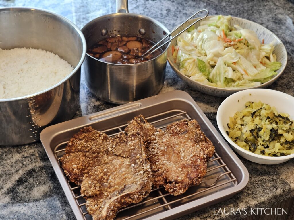 6. 我有事先準備滷肉滷蛋、炒酸菜、炒高麗菜和熱白飯,裝成一大盤炸排骨便當,就是超級台的一餐啦!