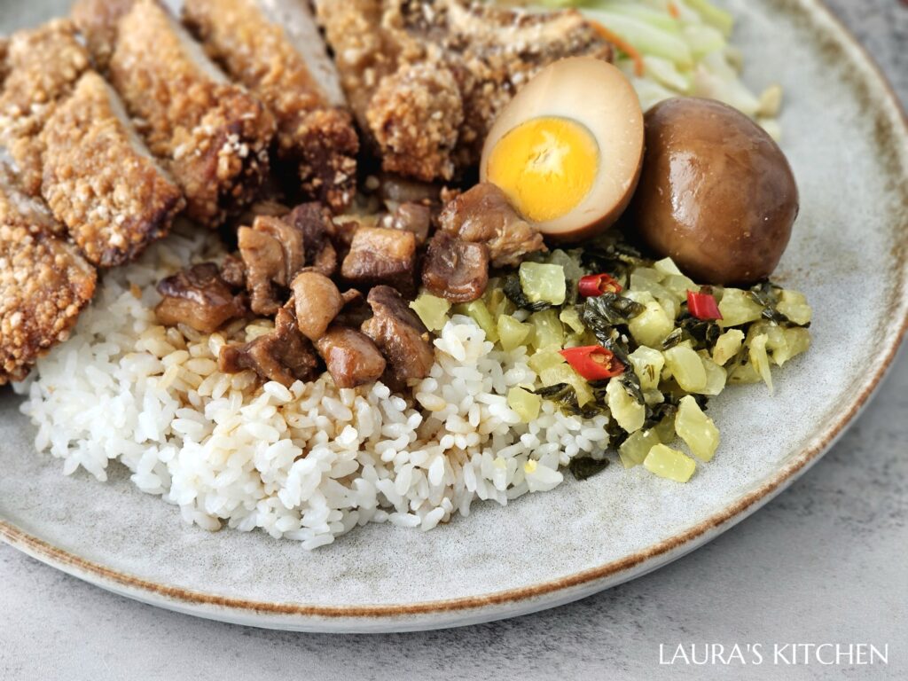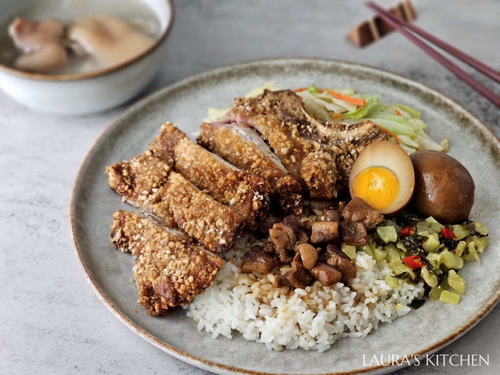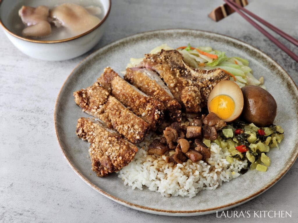 炸了比巴掌還大的酥炸排骨,是我最喜歡的顆粒感酥脆炸衣! 放在熱騰騰的白飯上,再淋一匙前一天煮的滷肉醬汁,配菜不用多,只要有脆甜的炒高麗菜、夠味的酸菜,最後再來一顆滷蛋,這一盤炸排骨飯台到讓我心花怒放,吃了超級滿足~~