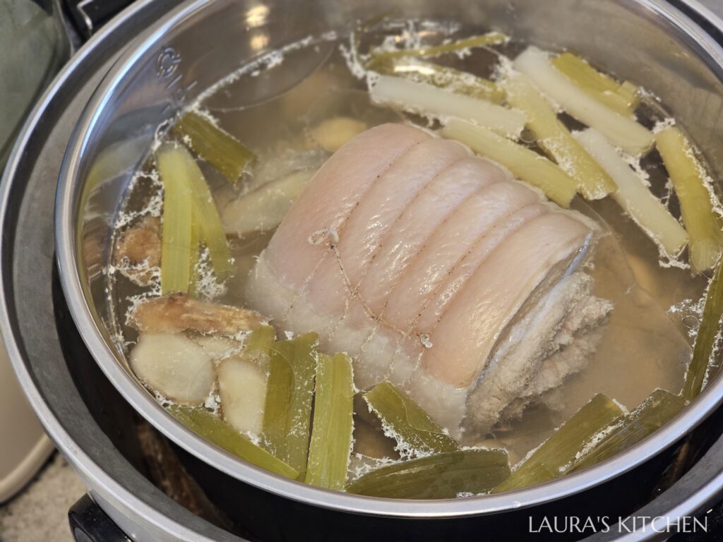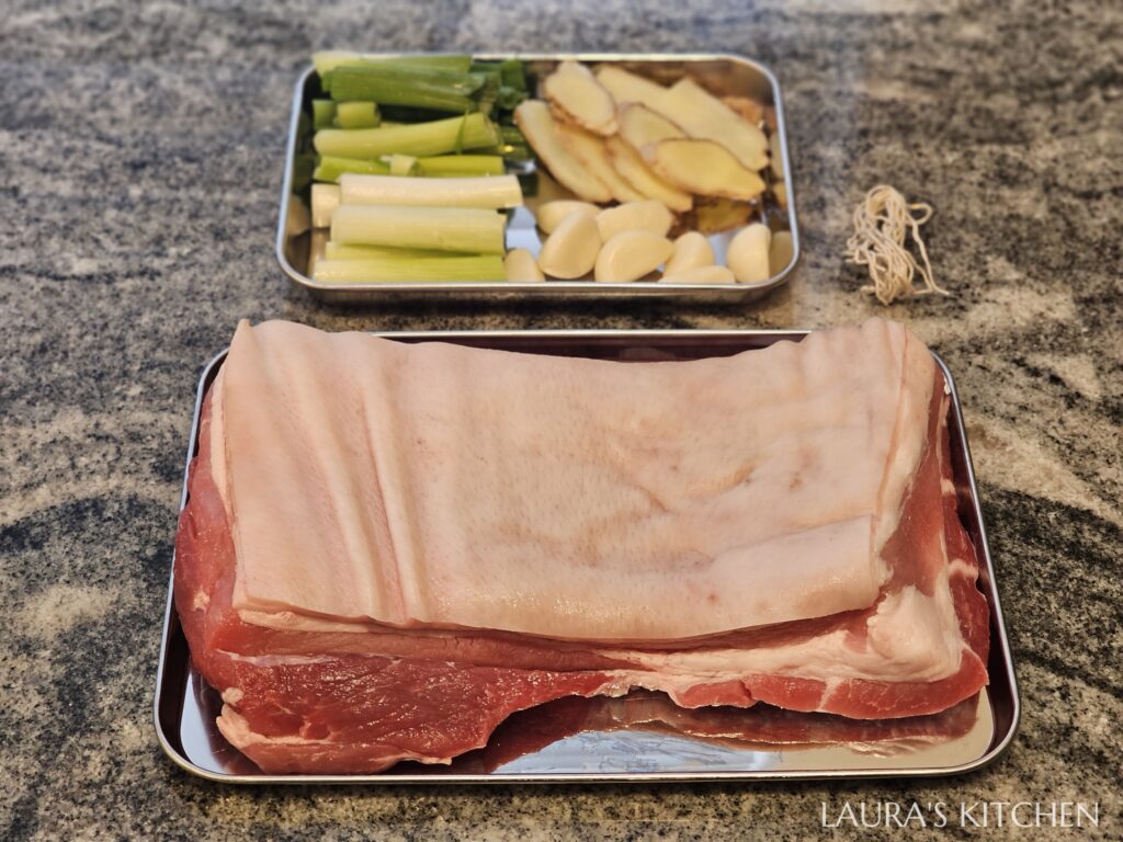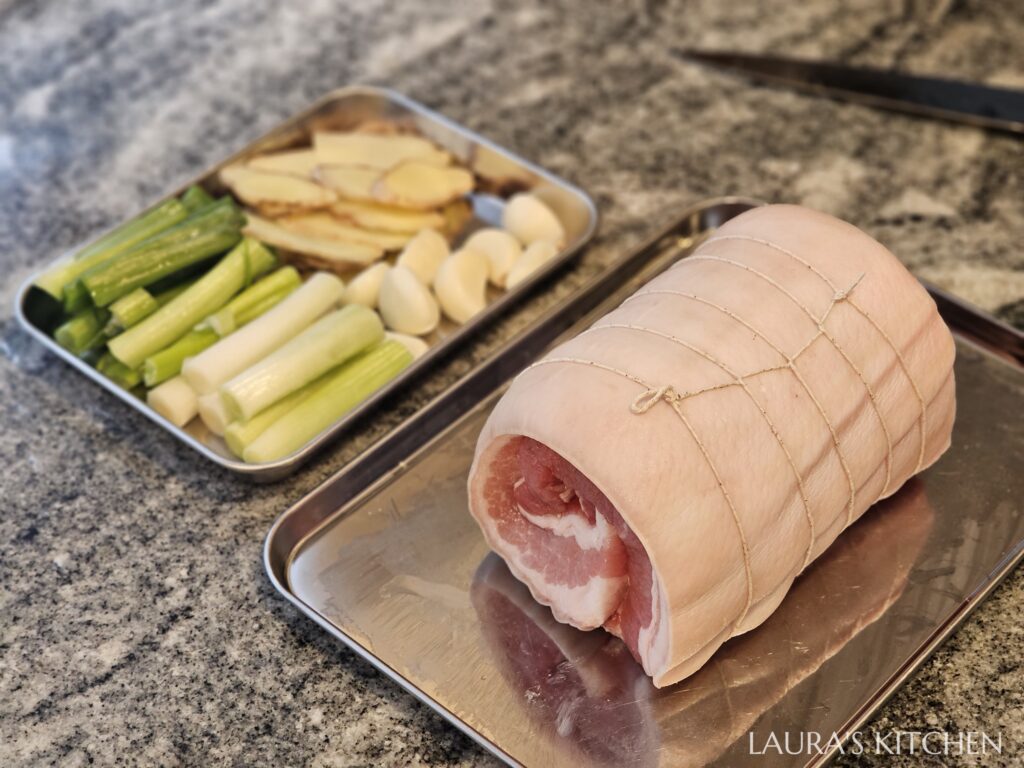 1.把蔥切段,老薑切薄片,蒜頭去皮。帶皮豬五花內側劃幾刀,皮朝外、肉朝內捲起來,用棉繩固定。放入電鍋,加入蔥薑蒜、水倒至淹過豬肉,電鍋蒸90分鐘(外鍋放6米杯水)