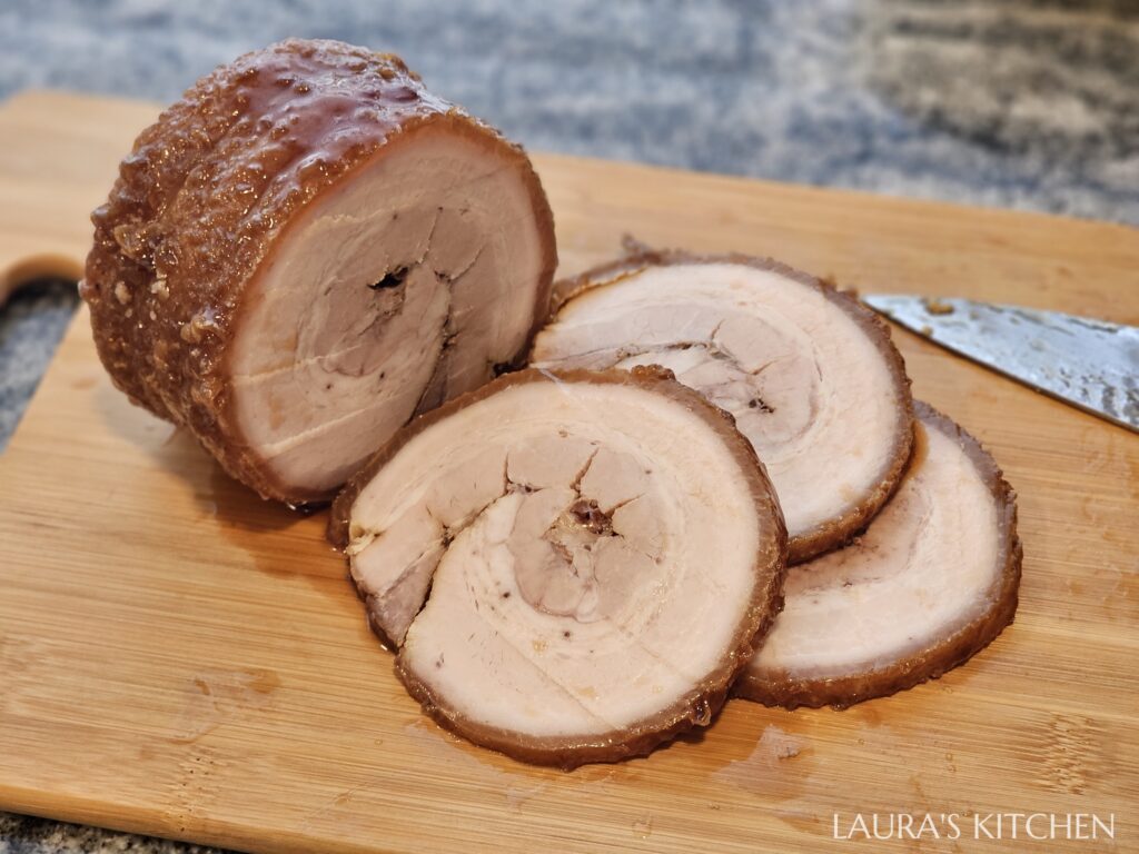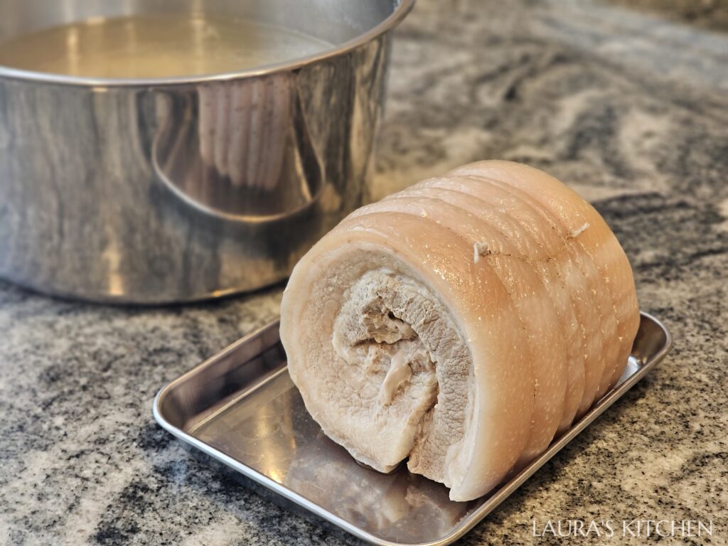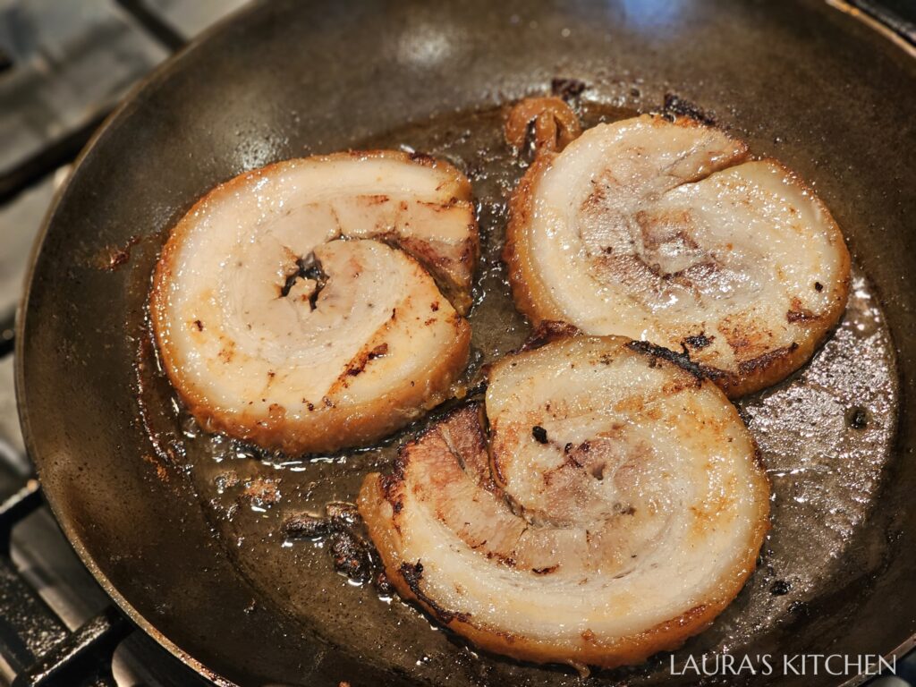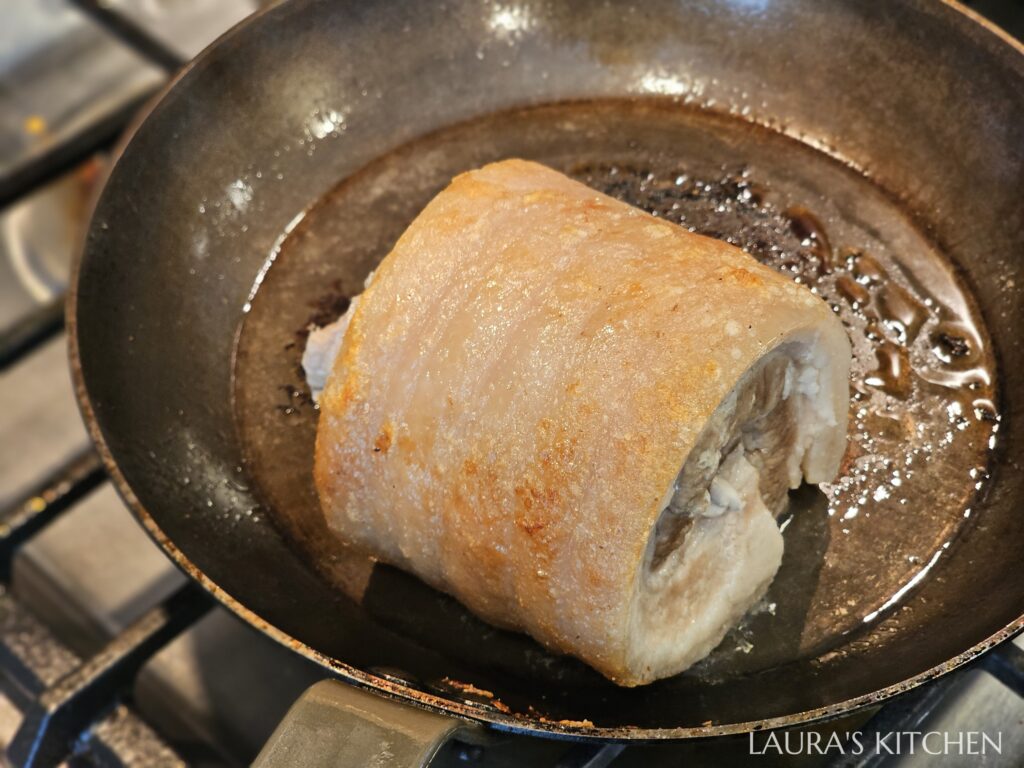 2. 蒸好後,你會得到超漂亮的五花肉捲,和一鍋鮮美的豬肉高湯! 把棉繩剪掉,水分擦乾,放入鍋中煎到外皮恰恰,但如果你很怕噴油,也可以改用氣炸鍋喔!