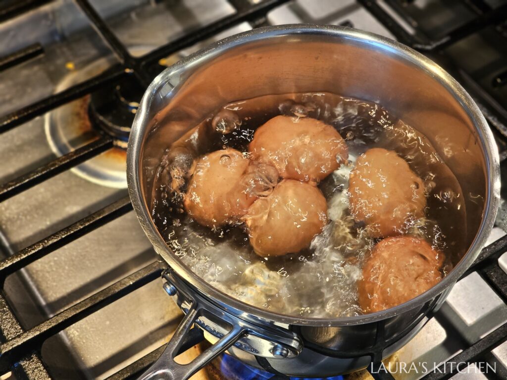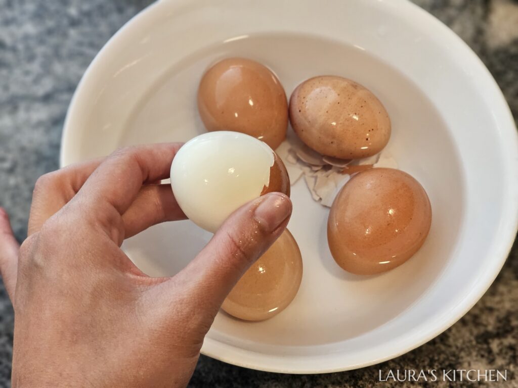 3.煮一鍋水,沸騰後放入雞蛋,中火煮6.5分鐘,時間到馬上撈起,泡冰水降溫。輕輕敲蛋殼,在水中用指腹溫柔剝開