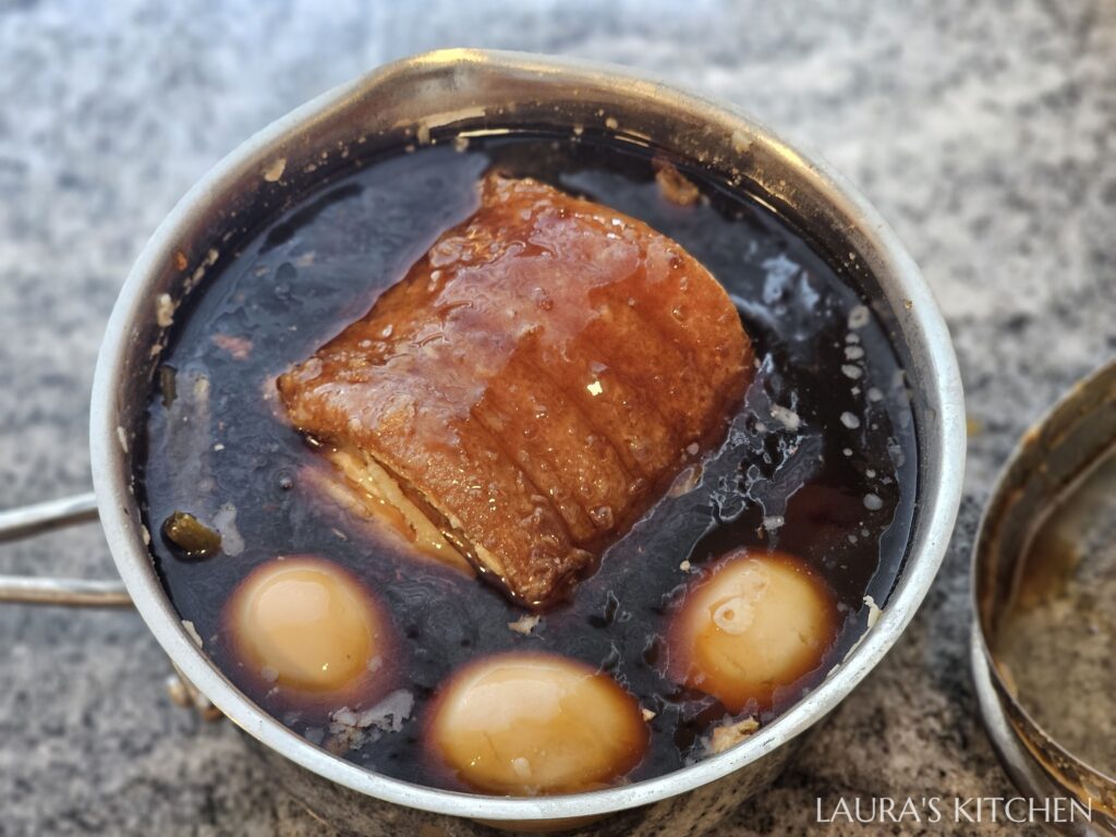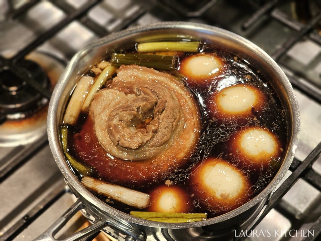 4. 取一個小湯鍋,加入叉燒肉、蔥段、蒜頭,倒入醬油、味霖、豬高湯煮到小滾,5分鐘後關火。待醬汁放涼後,再把雞蛋放入浸泡醬汁。雞蛋會浮到表面,用一張廚房紙巾蓋住表面,讓食材都浸泡到醬汁,冰入冷藏一夜