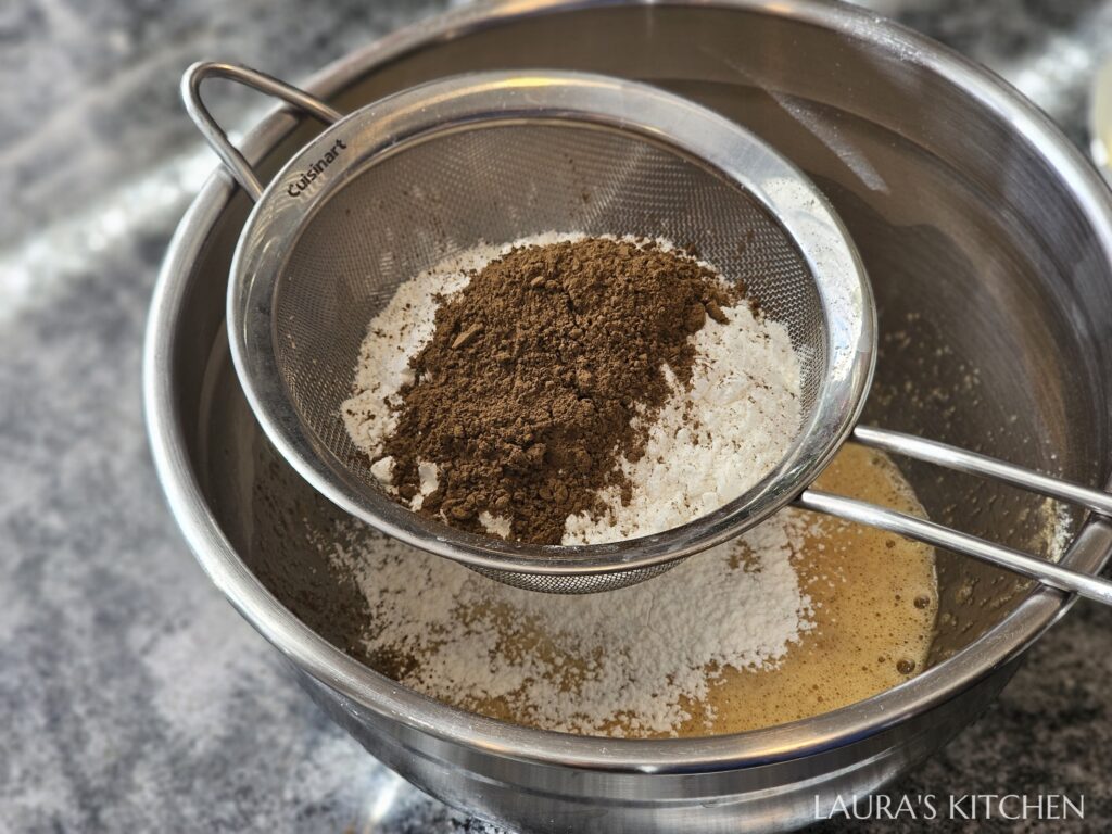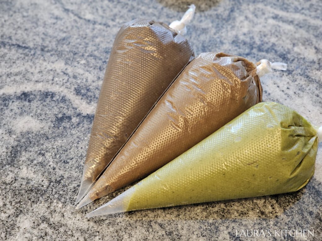 2. 雞蛋打散,加入砂糖攪拌到溶解。把泡打粉、低筋麵粉、焙茶粉(可換成抹茶粉等其他茶粉)過篩入盆,攪拌均勻後,再加入榛果奶油、蜂蜜,攪拌到滑順,裝入擠花袋,放入冷藏靜置一天。我一共做了三批不同口味: 焙茶、抹茶、巧克力