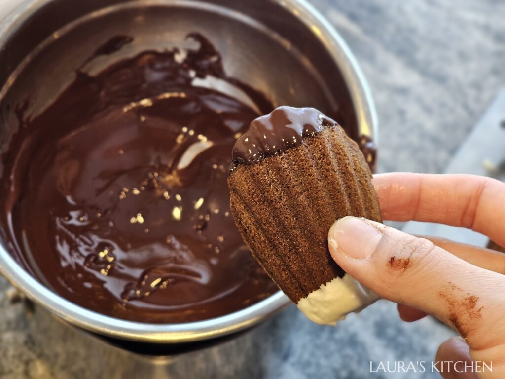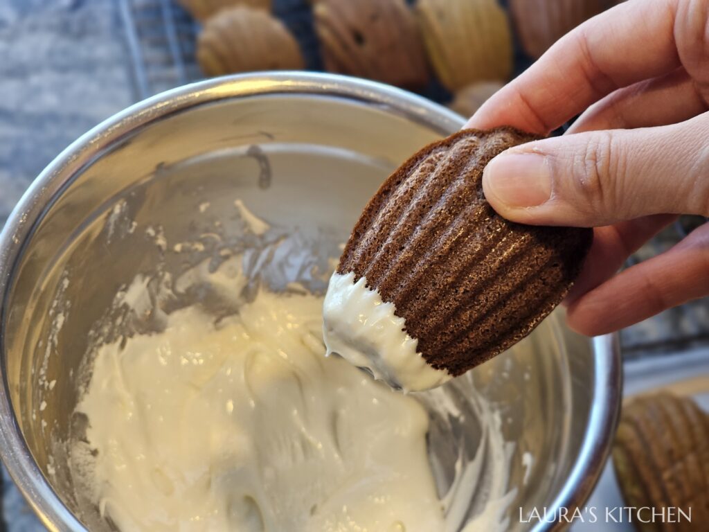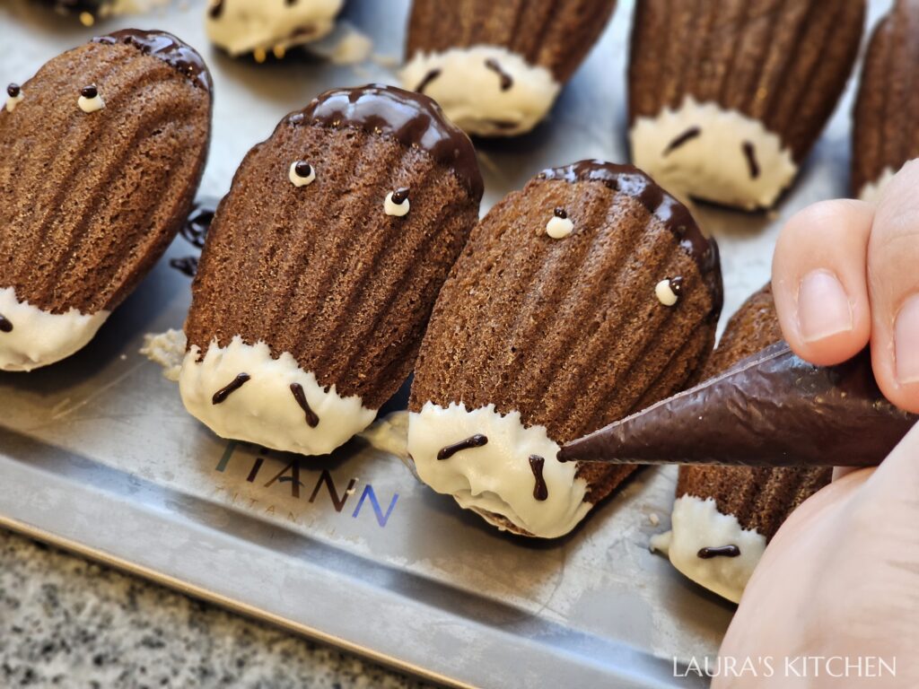 5.把白巧克力隔水加熱,融化後要馬上離火,否則會越煮越乾。瑪德蓮下方沾1公分白巧,是馬的鼻子,放到烤盤上冷卻。接著把巧克力隔水加熱(我用的是半甜巧克力semi sweet chocolate),沾瑪德蓮上方,是馬的瀏海。剩下的白巧、黑巧分別裝到擠花袋中,擠上眼睛和鼻孔。如果巧克力冷卻變硬,泡到40度的熱水中,軟化後再畫