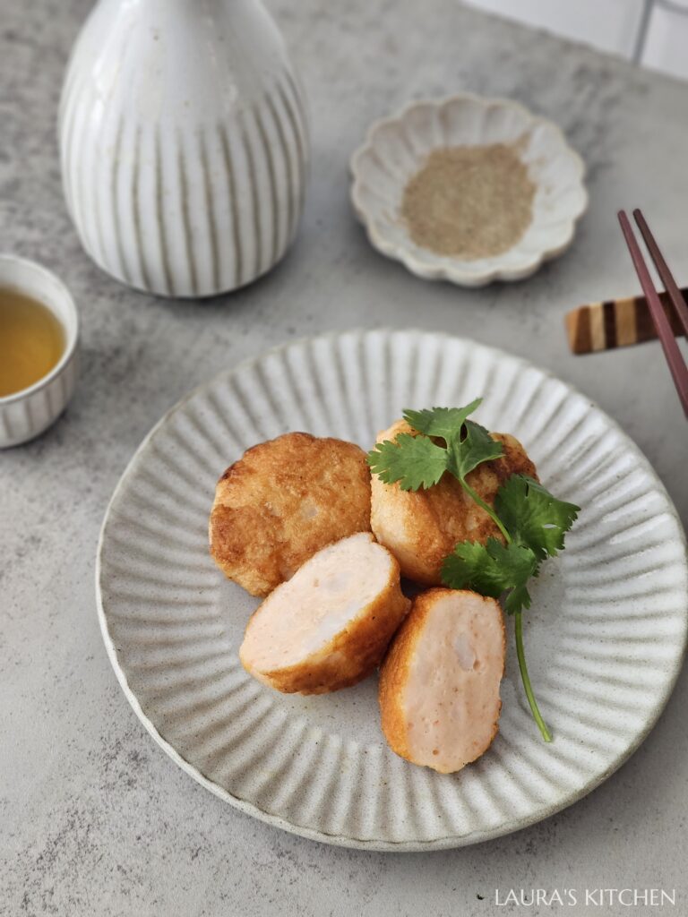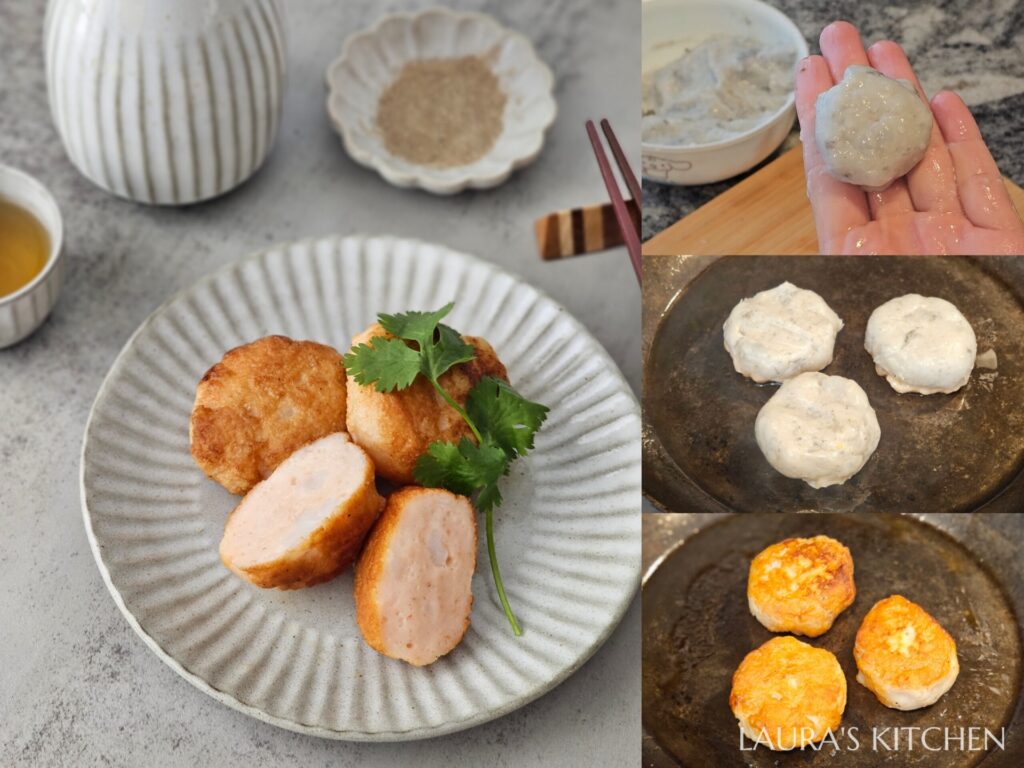 4. 金錢蝦餅: 手沾濕,抓一球蝦漿在手上甩成圓球,放入平底鍋輕輕壓扁,煎到兩面金黃,即可起鍋。超厚、超Q彈的蝦肉,撒上胡椒鹽,超級美味!