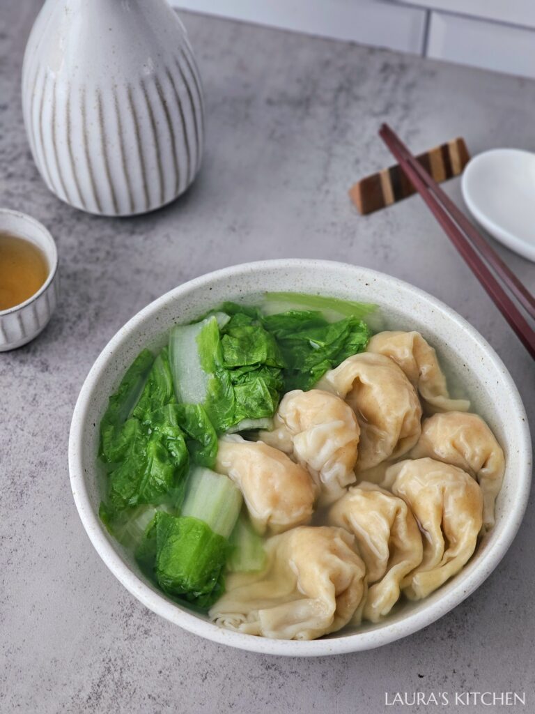 6.蝦肉餛飩: 取一小匙蝦漿抹平在餛飩皮上,用手掌虎口捏起,快速又簡單地就完成了! 把餛飩放入滾水中,煮到浮起水面,就可以撈起鍋囉。這碗蝦肉餛飩小孩超級喜歡,每次煮都必被秒殺!