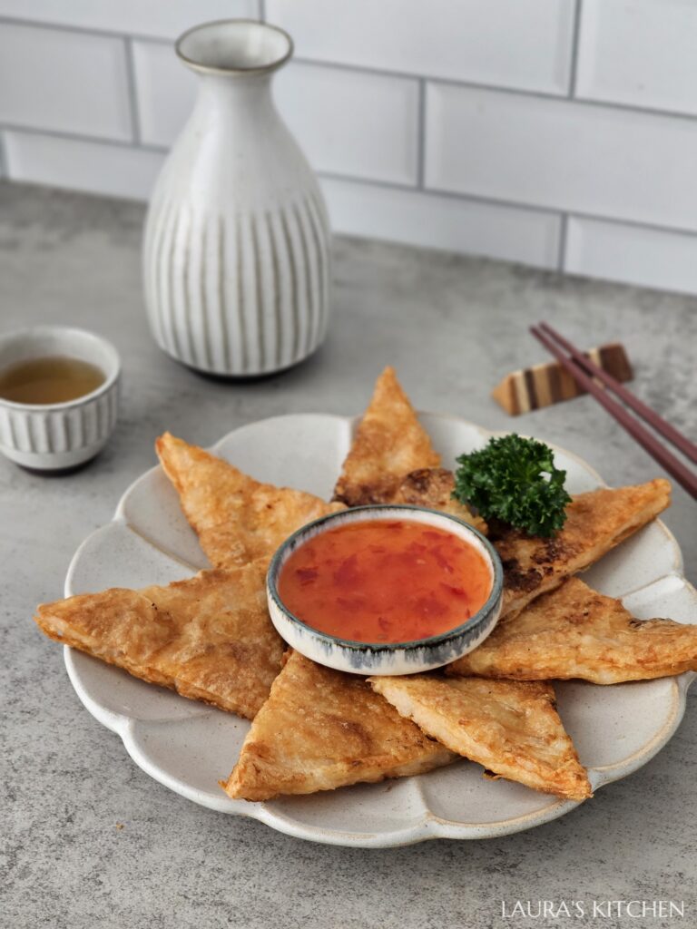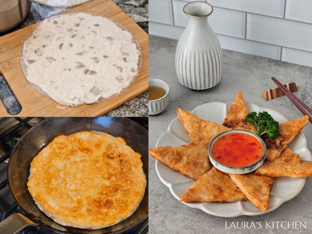 7. 月亮蝦餅: 用一片越南米紙當底,鋪一層蝦仁漿約0.5公分厚,再蓋上一片米紙。平底鍋放多一點油,用中大火把兩面半煎炸到金黃酥脆。煎好後切成八等分,搭配甜辣醬吃,好像回到台灣的泰國餐廳啦~~~