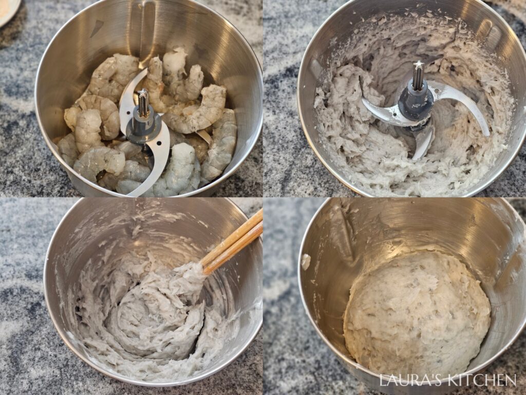 2.蝦仁300克放入絞肉盆中,按下絞肉機按鍵,把蝦仁瞬切成碎蝦肉。接著加入調味: 鹽、糖、白胡椒、香油,另外加豬油、讓口感滑嫩多汁,以及加蛋白、太白粉、冰水,讓蝦仁可以打出膠。打成蝦泥後,把刀片取出,改用筷子同方向畫圓攪拌 (也可用電動攪拌器),經過攪拌後的蝦漿,從原本鬆散的泥狀,會開始產生黏性,顏色變成透亮,這樣的蝦漿口感才會脆口Q彈。最後拌入預留的蝦仁丁,蝦漿就完成了