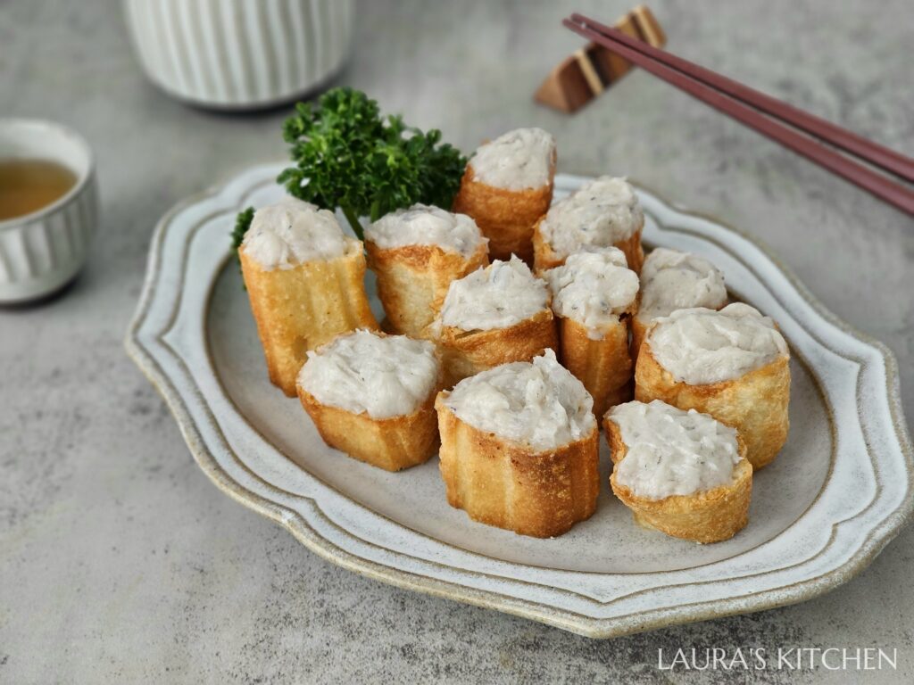 5.蝦漿油條: 把油條切小段,放入氣炸鍋烤到金黃酥脆,再把蝦仁漿填入油條的孔洞中,就是一盤超吸睛的火鍋配料: 蝦漿油條! 答應我,一定要加到麻辣鍋,油油辣辣的超級夠味!